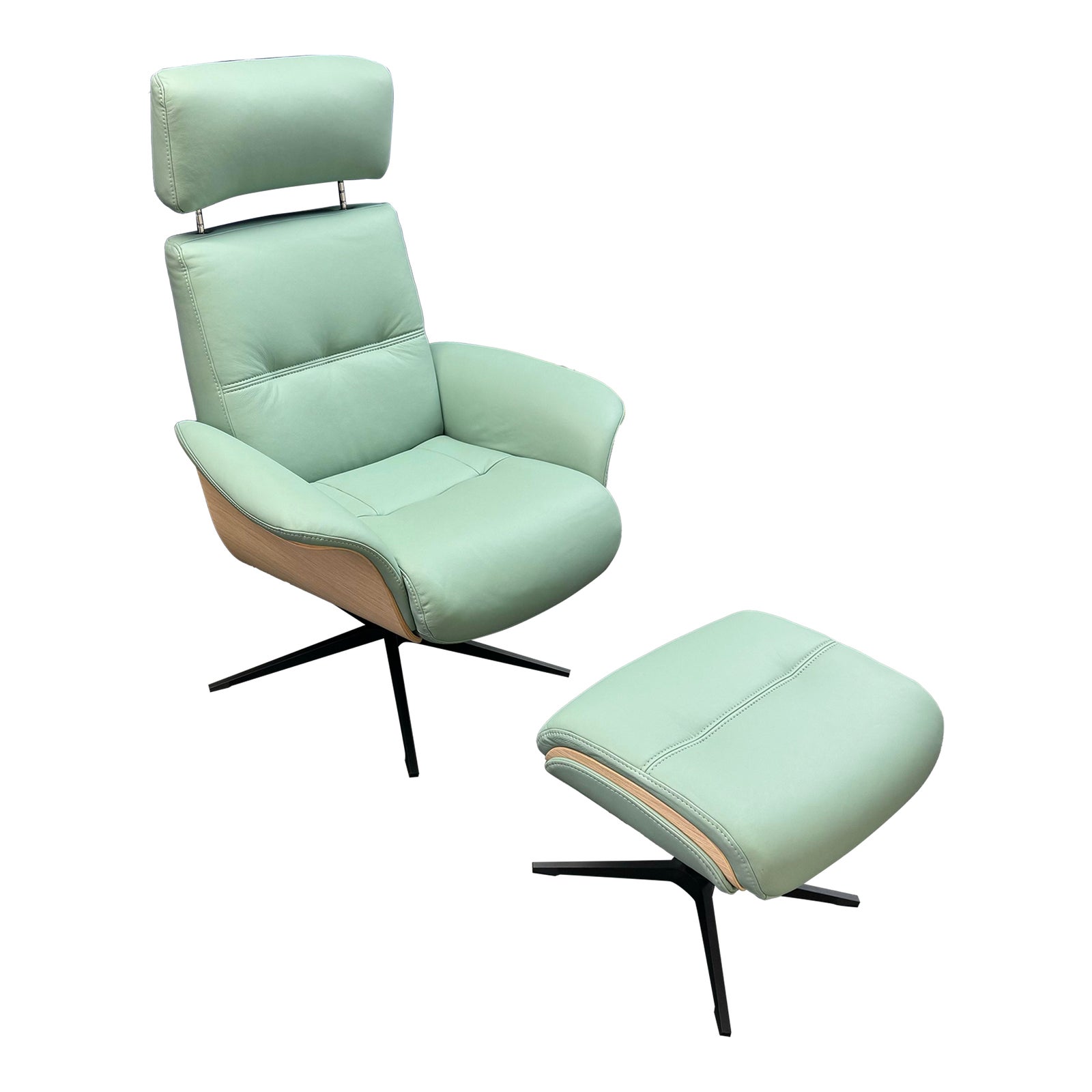 Design Plus Gallery presents a Space Leather Recliner + Ottoman by Img Usa. A luxurious and stylish reclining leather chair with a matching ottoman, perfect for any modern or mid century inspired space. The sleek design of the chair is complemented by the deep seafood green color of the leather upholstery, adding a touch of sophistication and elegance to any room. The light washed oak finish of the wood frame adds a natural and warm element to the overall design. This reclining leather chair is designed for ultimate comfort, with an adjustable back that allows you to find the perfect recline position for your body. The back also features a built-in headrest, providing extra support for your neck and head. The matching ottoman adds an extra level of relaxation, allowing you to kick your feet up and unwind after a long day. The chair and ottoman are supported by stylish metal bases in a sleek black finish, adding a modern touch to the overall design. The combination of the leather, wood, and metal elements creates a stunning and timeless piece of furniture. Whether you are looking to add a statement piece to your living room or create a cozy reading nook in your study, this reclining leather chair and ottoman set is the perfect choice. In good condition, with minimal wear from usage + age. Made in Thailand.