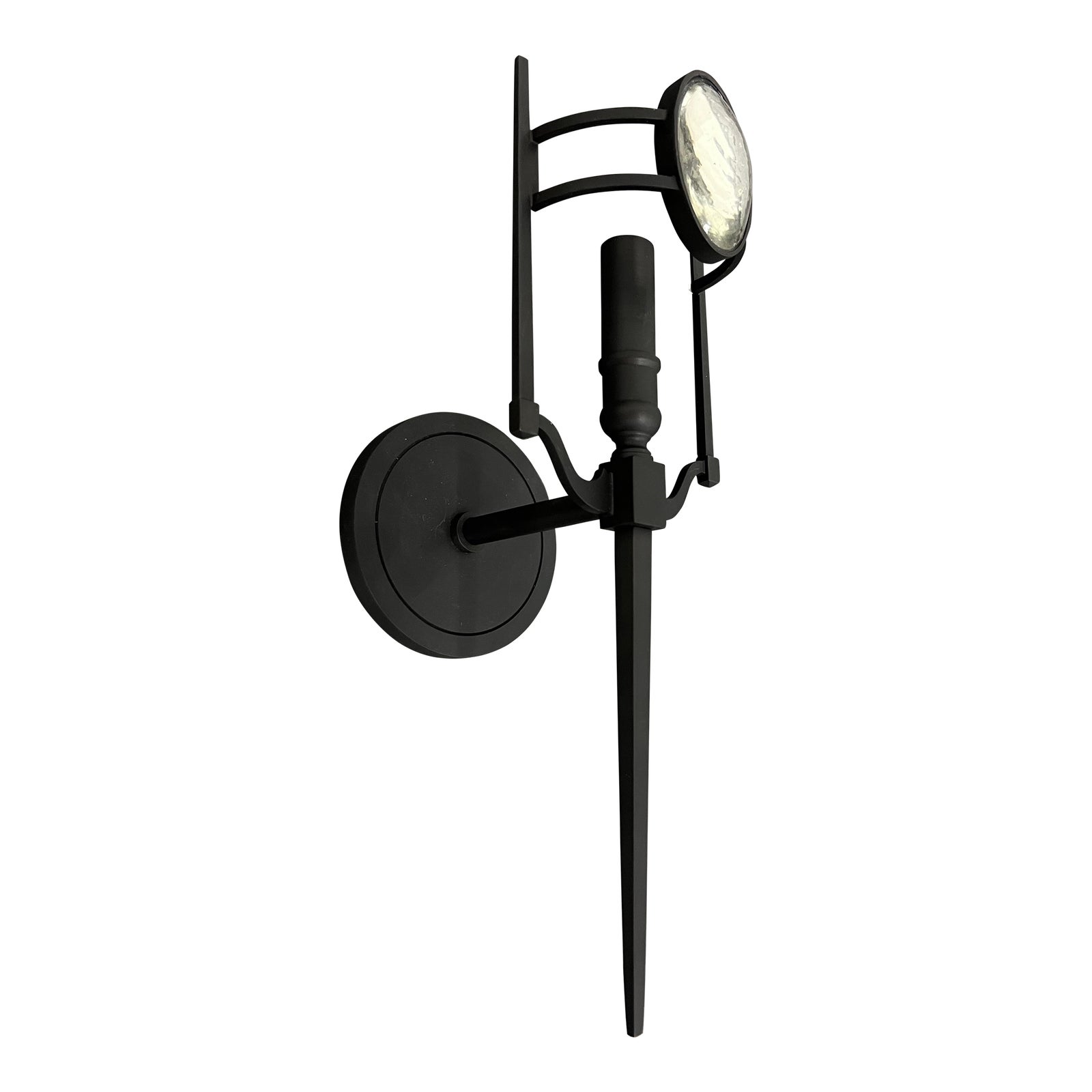Design Plus Gallery presents a Jonathan Browning Studios Chapelle Sconce. Hand forged iron is finished smooth with a black matte finish. A prismatic glass piece is encapsulated in a setting like a piece of jewelry. Sconce does not come with bulb. Sconce is in good condition. Style has been discontinued by Jonathan Browning Studios.