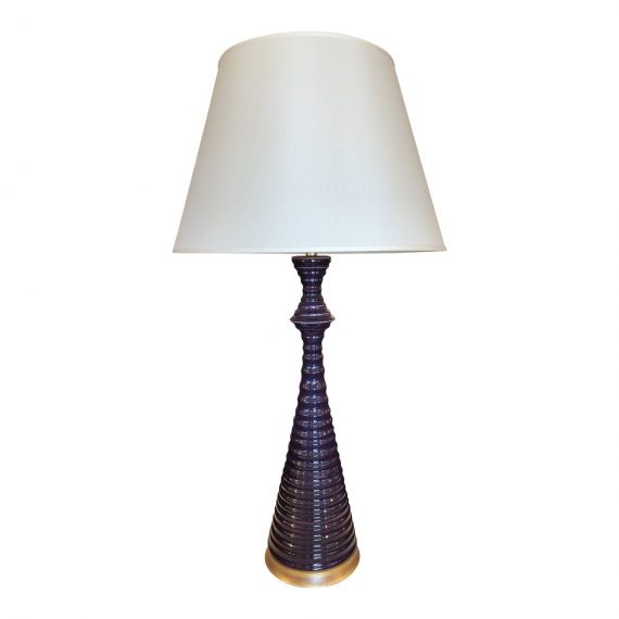 Design Plus Gallery presents a New Kimono Table Lamp by Hwang Bishop Designs Ltd. A rippling column of ceramic, the aubergine color is highlighted by brushed moon gold finished base and fittings. White linen shade. 3 way Switch on lamp, on/off on cord. Base 7.5″ diameter.