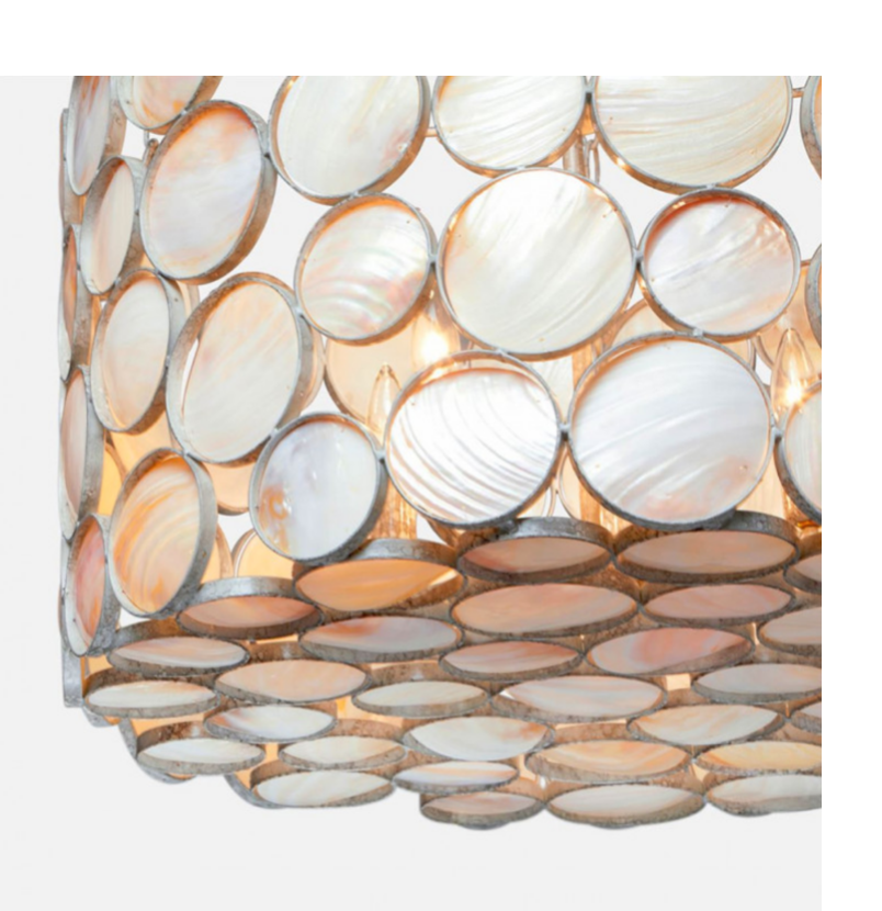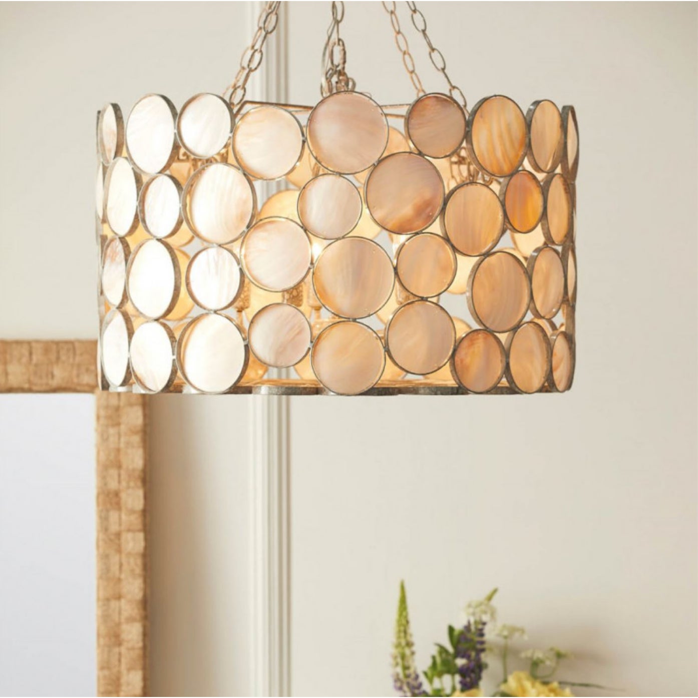 Design Plus Gallery presents a NEW Lunette Chandelier by Made Goods. Straight out of the box. Dazzling discs of striated kabibe shell are encased in metal and beautifully connected into a drum silhouette, creating the mod yet natural look of our Lunette. Light beautifully illuminates the neutrally hued material for a chandelier whose appeal changes from day to night.
