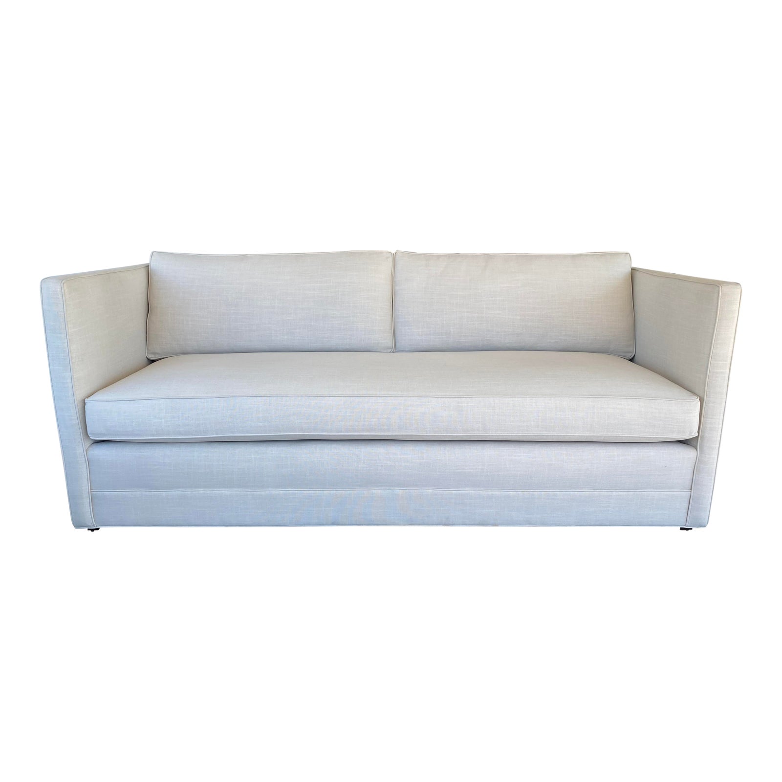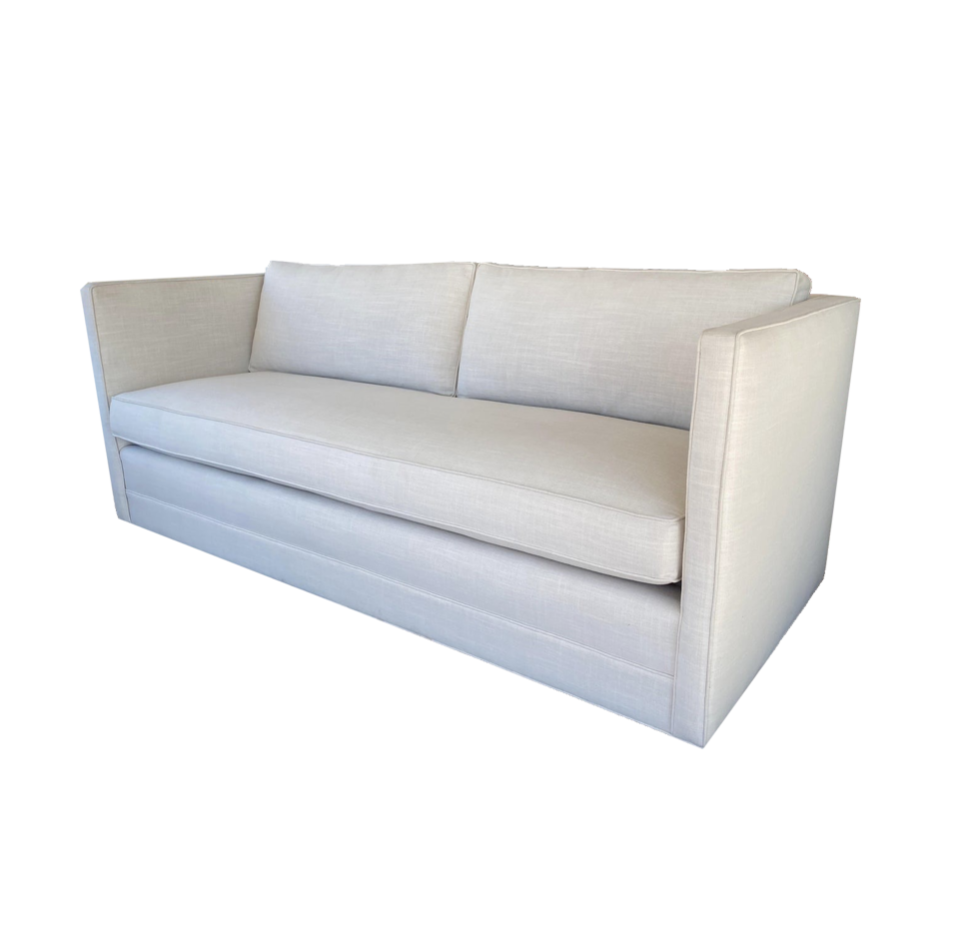 Design Plus Gallery presents a Miles Talbott Custom Landry Sofa with White Crypton Upholstery. Frame is constructed of kiln dried hardwood and constructed with a 8-Way hand tied system in North Carolina. Pocketed coils encased in 1.8-density foam and polyester fiber make up the seat construction as well. Fabric is 82% Crypton-treated cotton and 18% Crypton-treated polyester for added durability and worry free ease. Fixed back is blown conjugated polyester fiber in a channeled non-woven tick. Bench seat and back cushions are made of conjugated microdenier polyester. Soft seat makes for a dreamy lounge session.