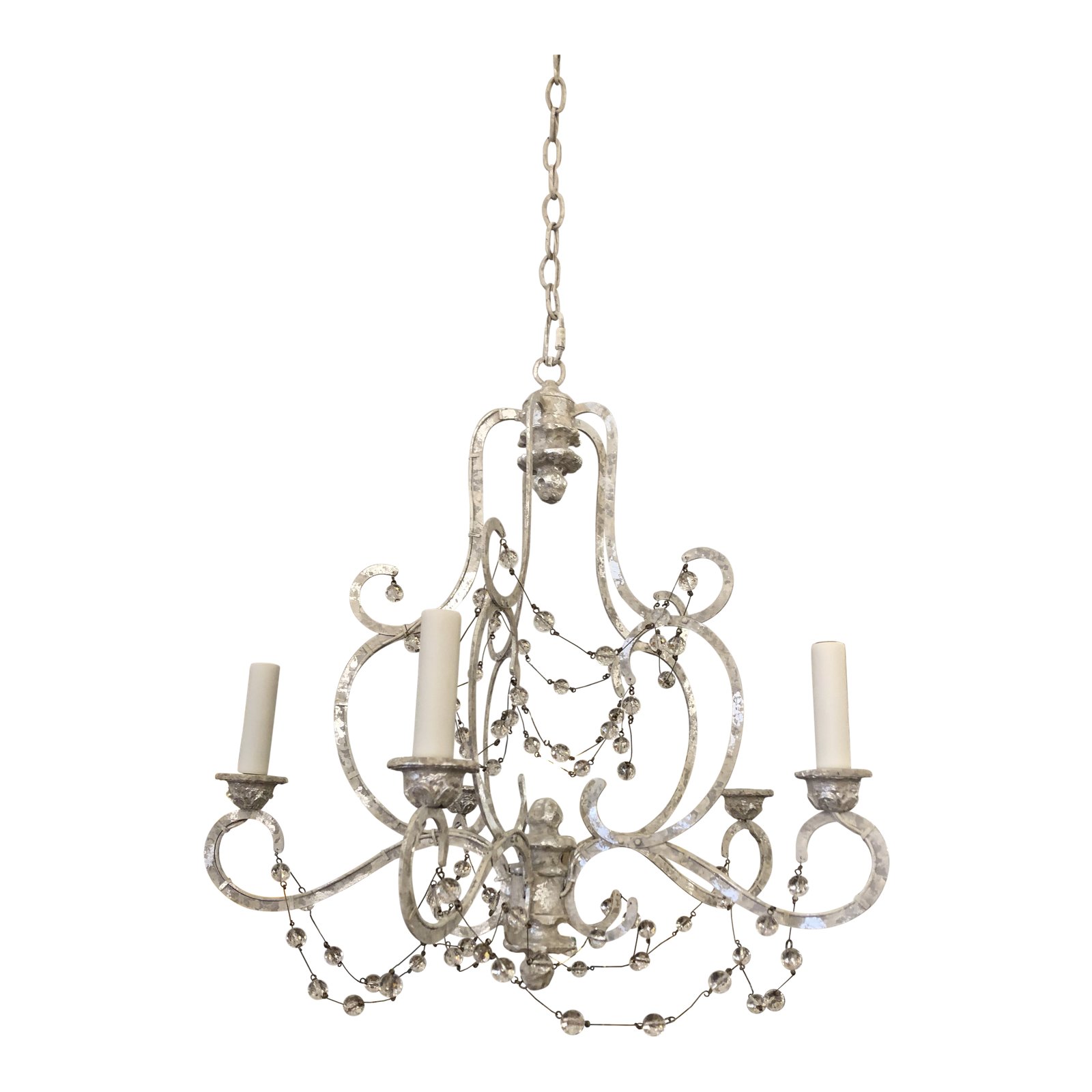 Design Plus Gallery presents a New Five light Avignon Chandelier. The simplicity of the final, graceful design reflects the Zen-like experience. A French shape metal frame is in a distressed silver finish, wrapped with a rope of unique, faceted crystals.