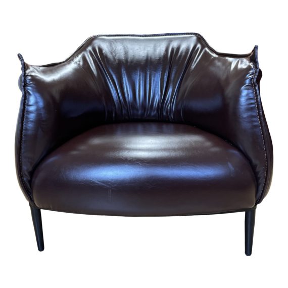 Design Plus Gallery presents a Chilton Chair by New Pacific Direct Furniture. Strong and soft, the arms are open like petals, welcoming you into its cushioned embrace. The deep color of the supple polyurethane leather glows, lending an air of modern distinction to a seating area. Detailed stitching on the back side is a work of art. Minor pealing on back and front.
