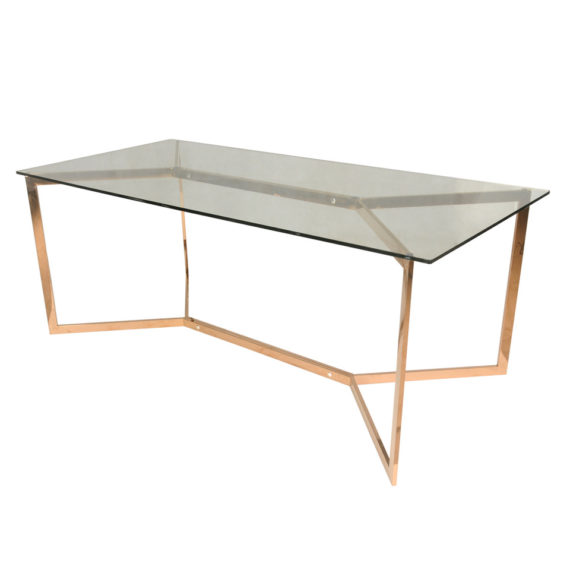Design Plus Gallery Presents a gorgeous Art Deco Inspired Contemporary Campbell Dining Table by New Pacific Direc Inc. A robust rose gold frame sleekly supports a rectangular glass table top. Simple and elegant centerpiece for your lavish or minimalist dining room.