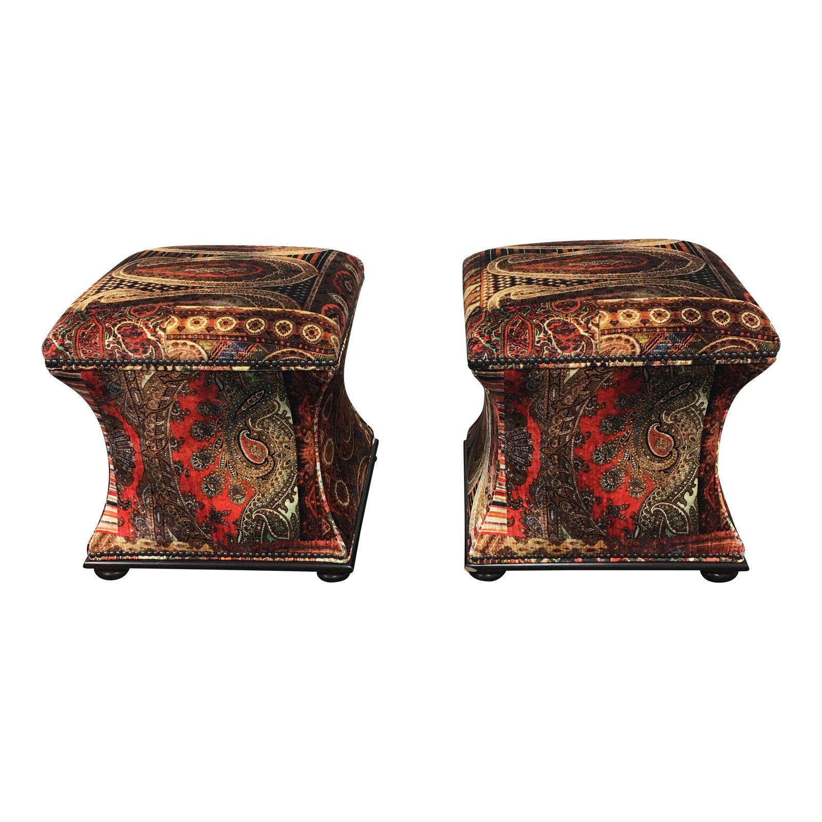 Design Plus Gallery has a brand new pair of Charles Hassocks Ottomans by Hickory Chair Co. Since 1911, Hickory Chair has maintained an old-school dedication to fine craftsmanship, particularly when it comes to upholstery. With a paisley velvet upholstery, these fantastic ottomans will bring a sense of joy and style to your household. Sold as a set of two, these ottomans will thrive in living spaces with a traditional furniture appeal. The nailhead trim is a black pearl finish. Original Price: $7,020.00