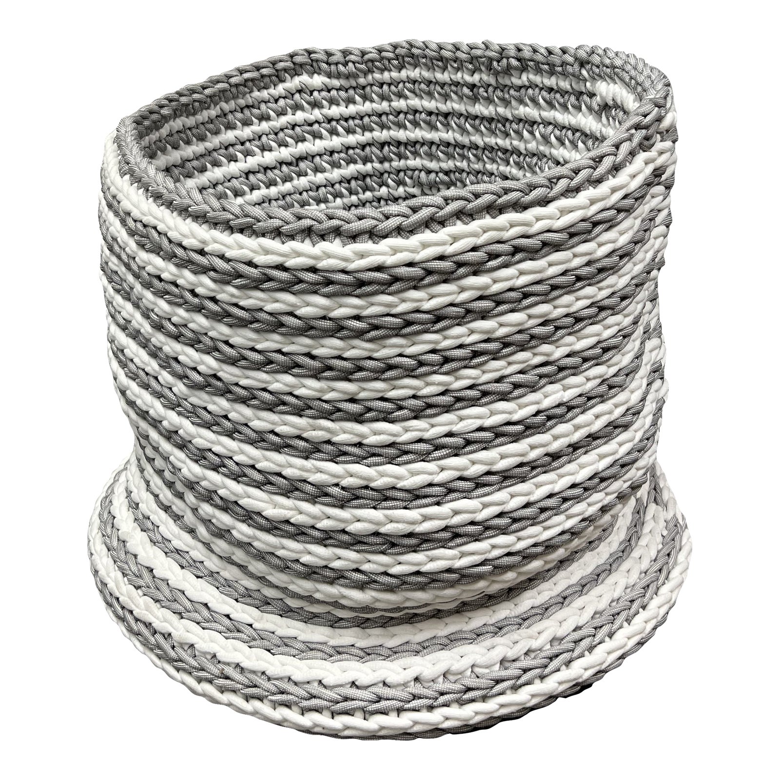 Design Plus Gallery presents a Large Palecek Hilo Basket. Hand woven cotton rope alternates in a crisp white + grey stripe. There is minor wear on the base, basket is in good condition. Made in the Philippines. Palecek is revered in the design industry for the organic modern aesthetic and have been creating for nearly fifty years. Minor wear.