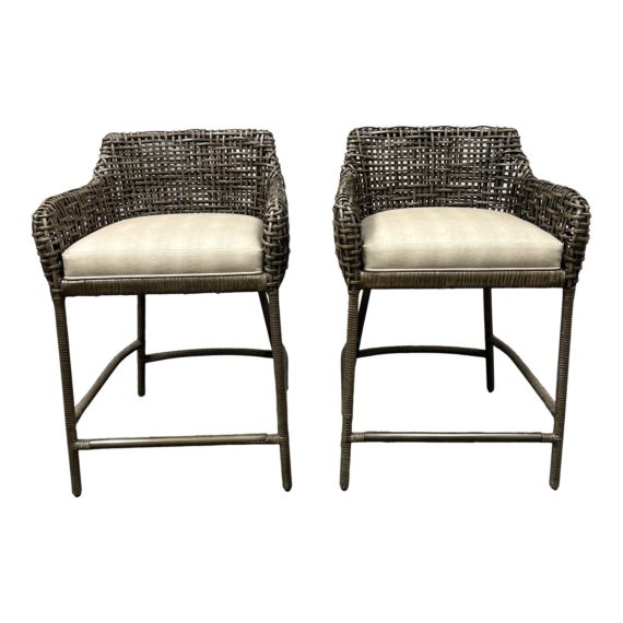 Design Plus Gallery presents a Pair of Seacliff Counter Stools from Palecek. These stools have an Iron frame + legs that are hand-wrapped with rattan peel. The open rattan weave on inside and outside back and arms all in an elm grey finish. Barstool comes with a fixed upholstered seat and a pewter finished footrest on front stretcher. Both are in good showroom sample like condition with minimal wear.