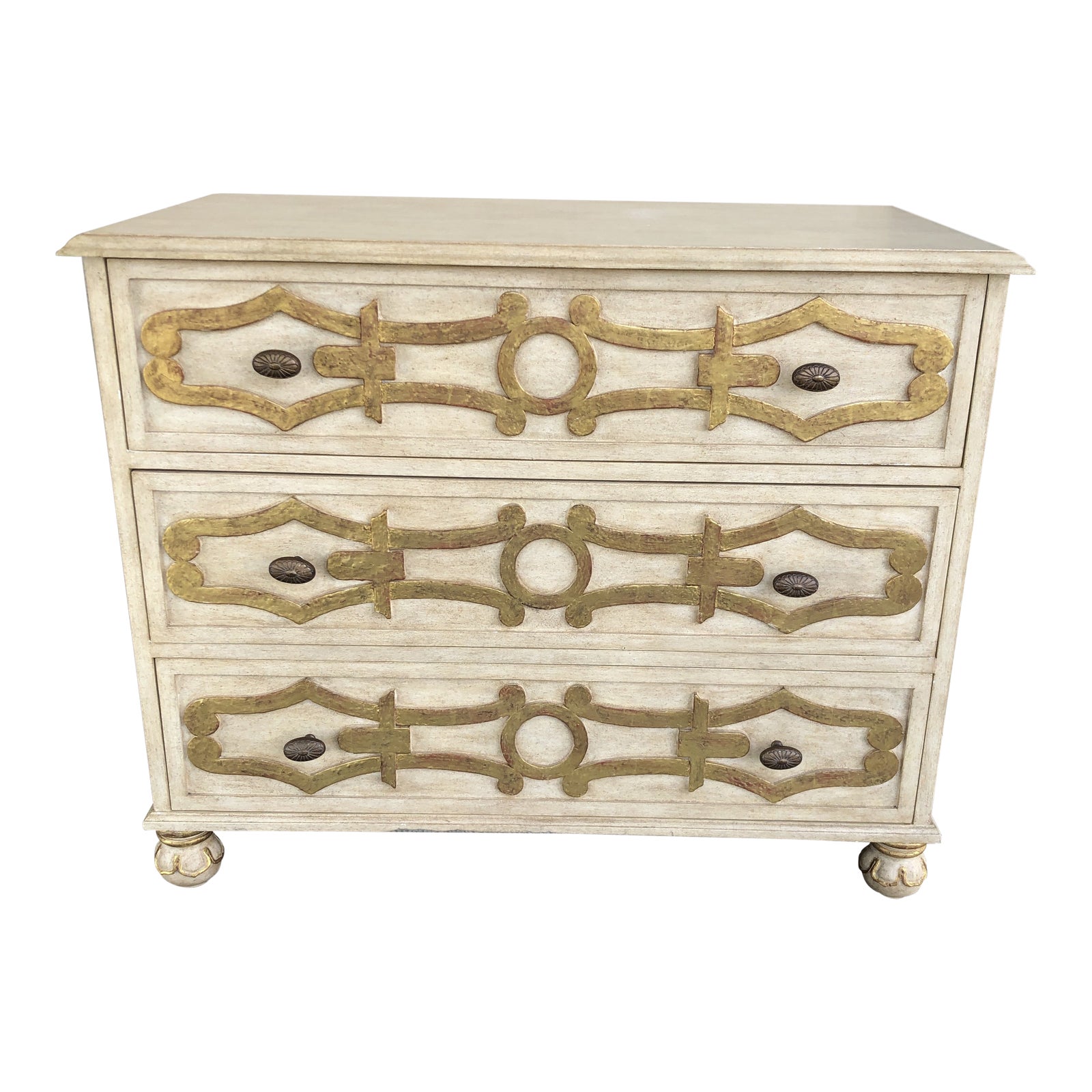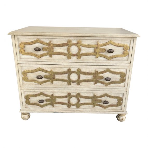Design Plus Gallery presents a stunning NEW Piedmont Commode by Panache Designs. Stunning handprinted and carved details, the dresser sports three roomy drawers, gilt trim, brass pulls and bun feet.