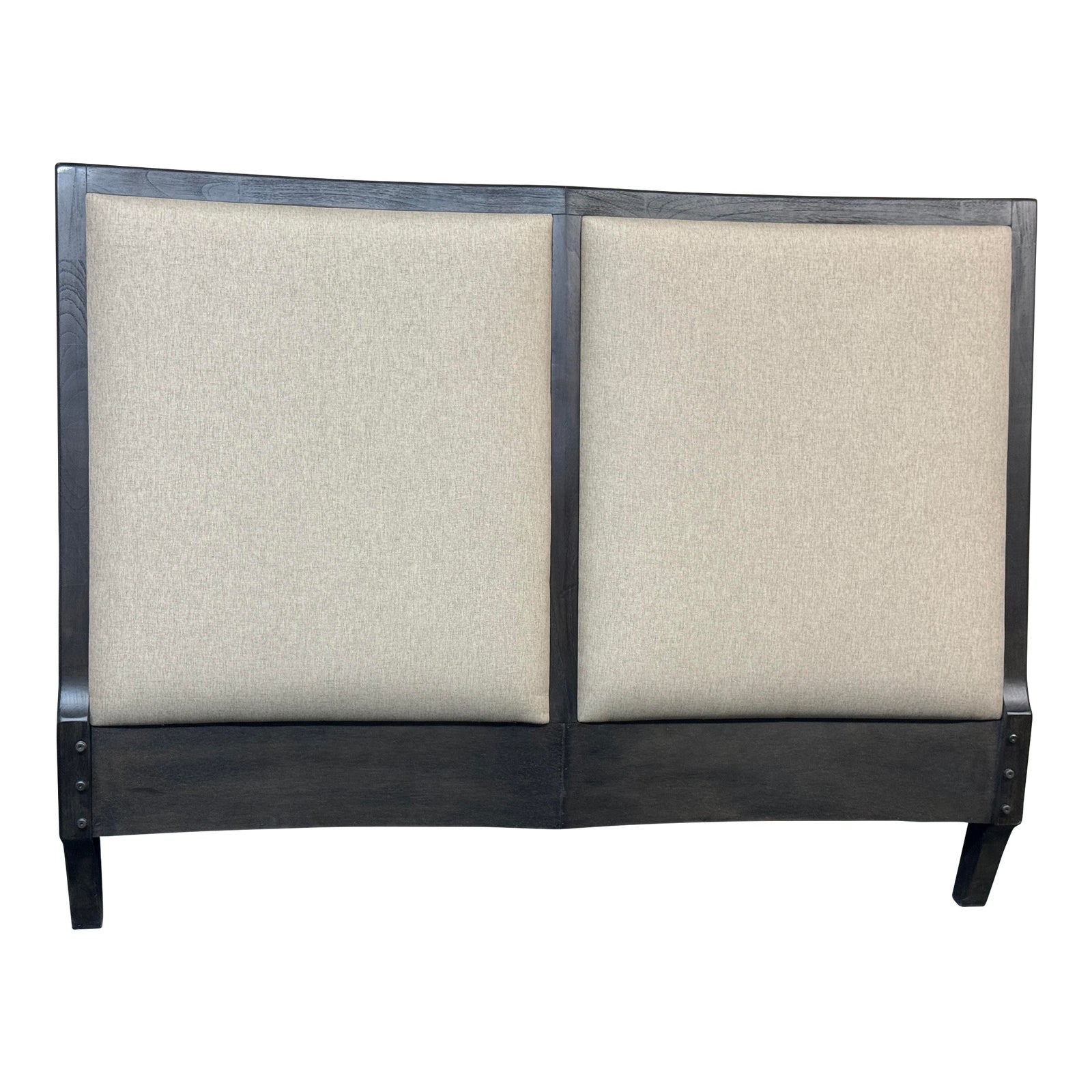 Design Plus Gallery presents a Queen Sized Panel Bed by Brownstone Furniture. The contemporary silhouette is augmented with a pair of deeply cushioned panels, upholstered in an oatmeal weave inset in the richly grained teak with a sandblasted, mink finish. Light evidence of wear; condition is consistent with age and use.