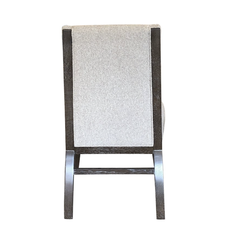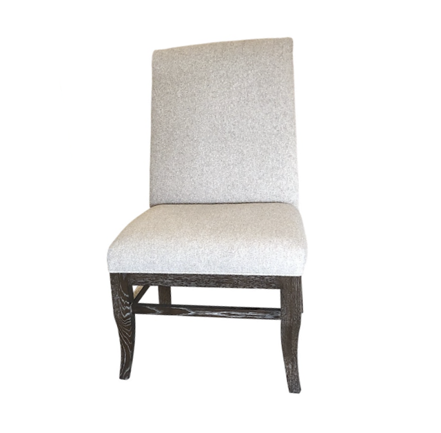 Design Plus Gallery presents a Side Chair by Beverly Furniture. Wonderful textured boucle fabric is upholstered over deep cushions on a gray cerused frame. The striking wood extends up the back of the chair to elegant effect.