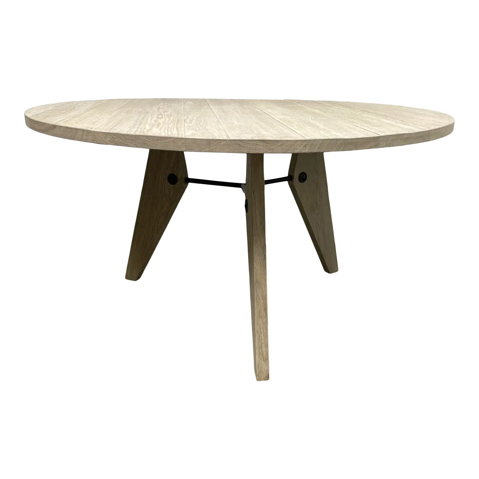 Design Plus Gallery presents a new Restoration Hardware Custom Design District Round Dining Table. Solid elm wood is given a white wash finish with tonal wood grain texture. Industrial vibes are connected with metal struts on the playful geometry of the three triangular legs. Top has a distressed look with planks of wood to give a organic modern aesthetic.