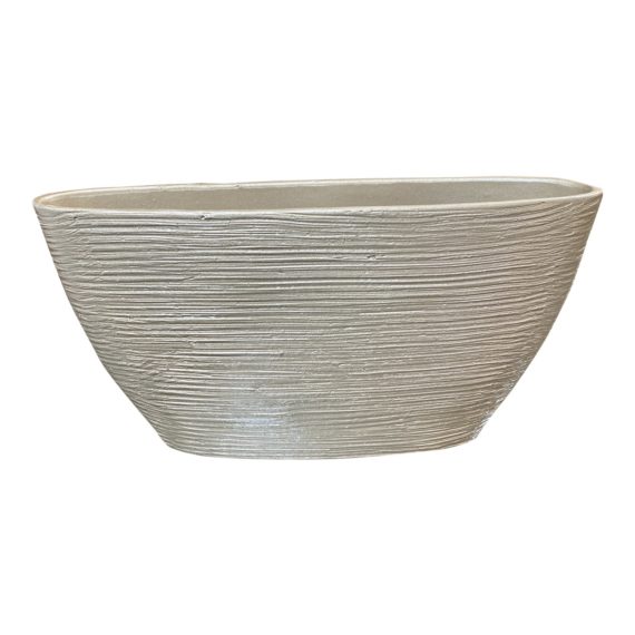 Design Plus Gallery presents a Sculptural Oblong Vessel. Ribbed exterior has a textured surface that has a subtle sheen with the cream glaze. Little evidence of wear, showroom model. Made of plaster.