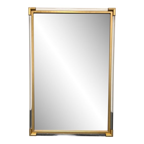 Design Plus Gallery presents a New Bailey Mirror by Shades of Light. A rectangular mirror with beveled edges is secured in a primarily MDF frame with a gold finish. The frame also features an outer layer of. clear acrylic. Minor wear; mirror is in good condition.