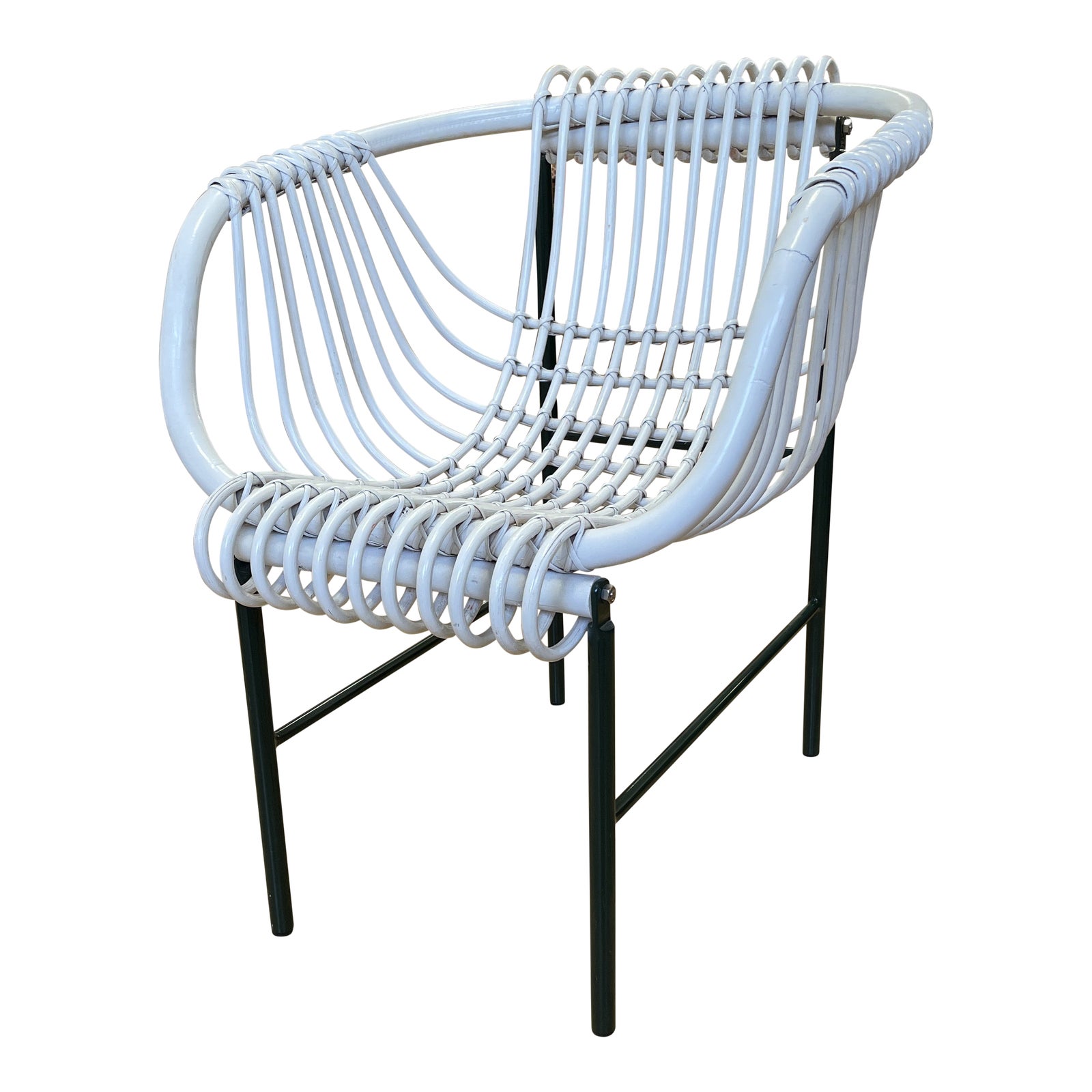Design Plus Gallery presents a Strala Seefelder White Rattan Chair. Curved rattan intertwines like a vine around a black powder coated chrome metal frame. Playfully graphic dance connects the curved form to the linear base. Opposites complement in this organic modern statement. The Seefelder collection came from a three year journey exploring the technical and aesthetical abilities of rattan. An objective to create a relaxed modernity was achieved. The chair celebrates the poetry of everyday life and gives a relaxed feeling of a natural get away. Minor wear on surfaces, good condition. Made in Switzerland.