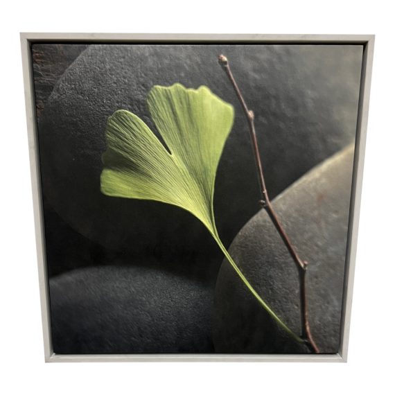 Design Plus Gallery presents a NEW “Ginko”, A Giclee on Canvas by Gayle and Glen Wans for Studio El. The giclee focuses on a single gingko leaf that remains on a branch, with rocks in the background. It is secured in an open edge frame with a white finish. A hanging cord is attached in the back. Minor tear in back. Minor wear consistent with use; giclee is in good condition.