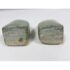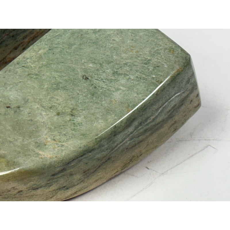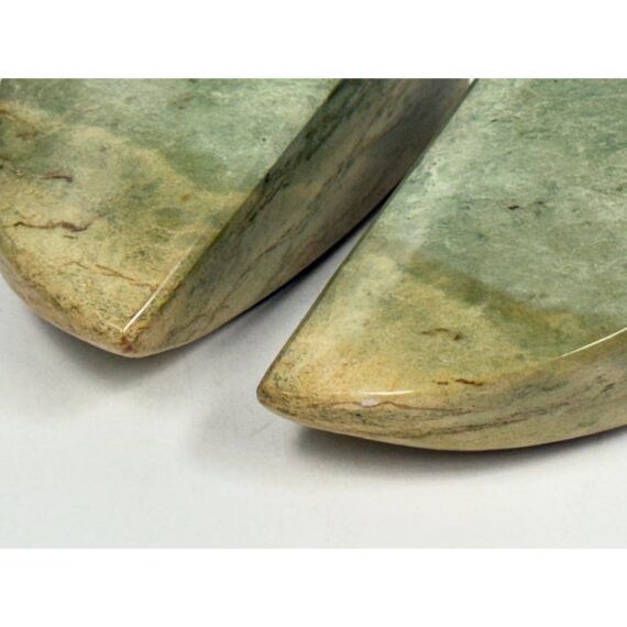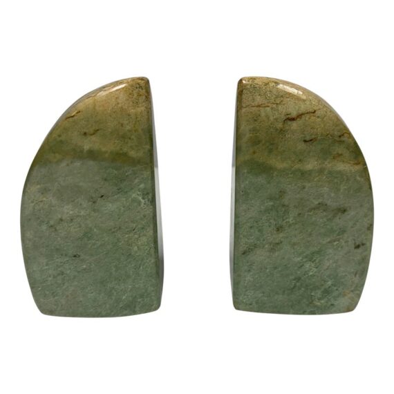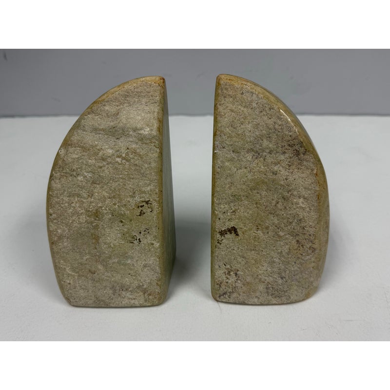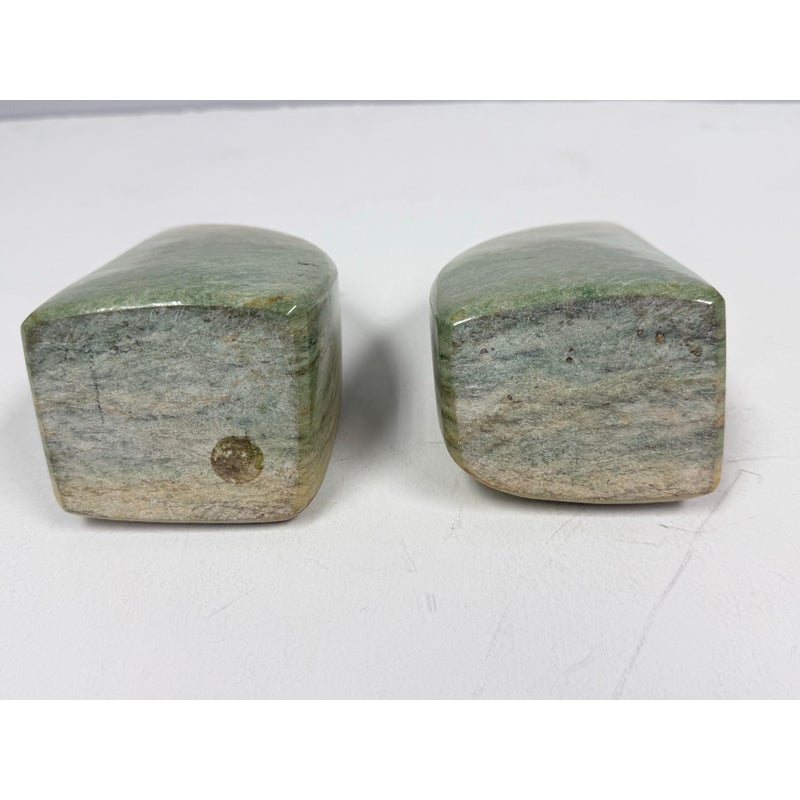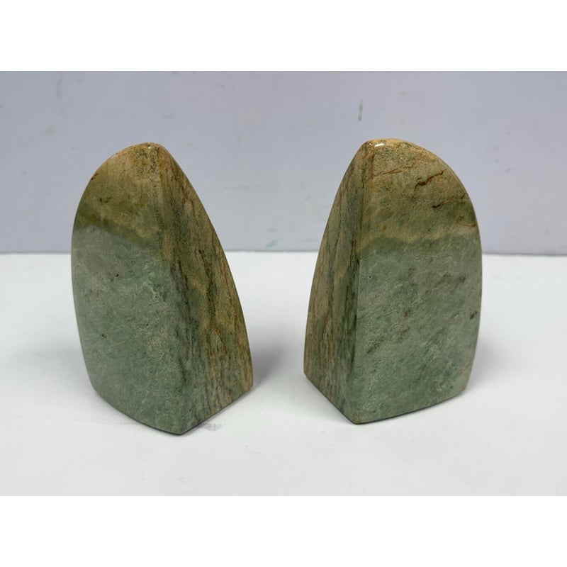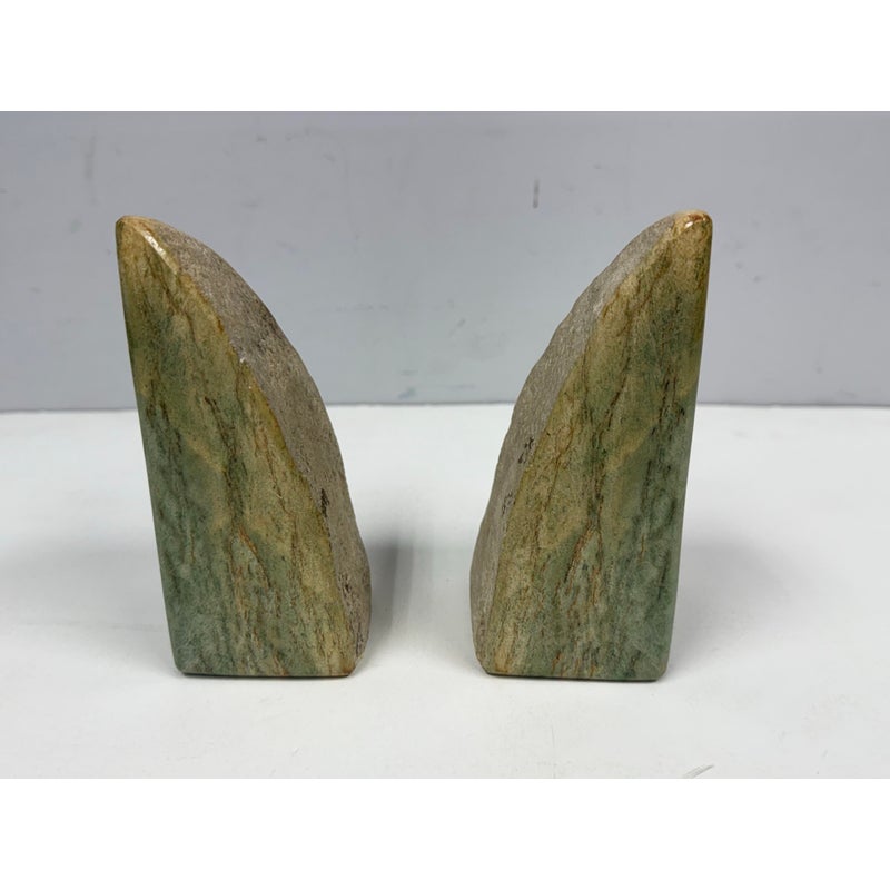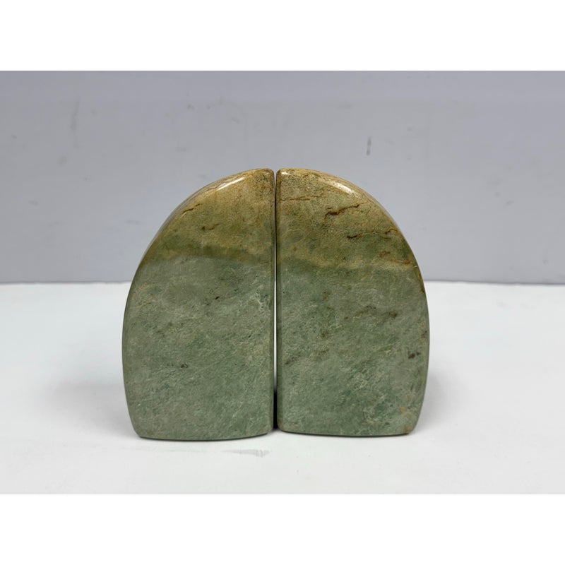 Design Plus Gallery presents a Pair of Green Stone Bookend. Made from natural stone, known for its rich green hues and symbolic associations with purity, harmony, and wisdom. Designed to keep books, magazines, or other items organized on shelves or desks. Each piece often features unique natural patterns and variations in color and texture, adding a touch of natural beauty to any space. In good condition, minimal wear.