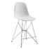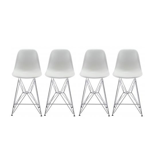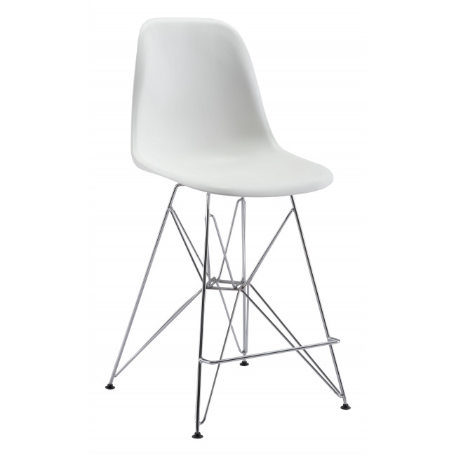Design Plus Gallery presents a set of Four Zip Counter Stools by Zuo Modern. The ultimate in mid-century design, this molded scoop seat in white ABS plastic is the perfect height for kitchen island seating. Its architectural base is made of steel with a polished chrome finish. Black feet are plastic to protect your floors. These items were used as showcased staging items.