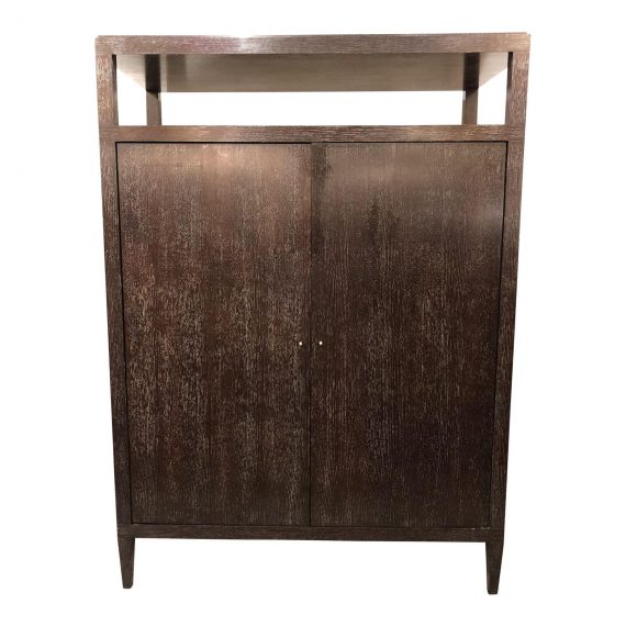 Design Plus Gallery presents a custom Television Armoire. The piece was produce by Newman Studio of Hollywood California. The piece was constructed using Cross Sawn Oak, the piece was finished using a Ceruse method. It boasts retracting pocket doors for easy viewing. The interior a number of shelves for components. The clean simple lines allow this fairly large piece simply float in a room.