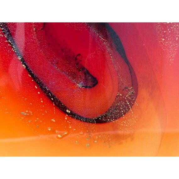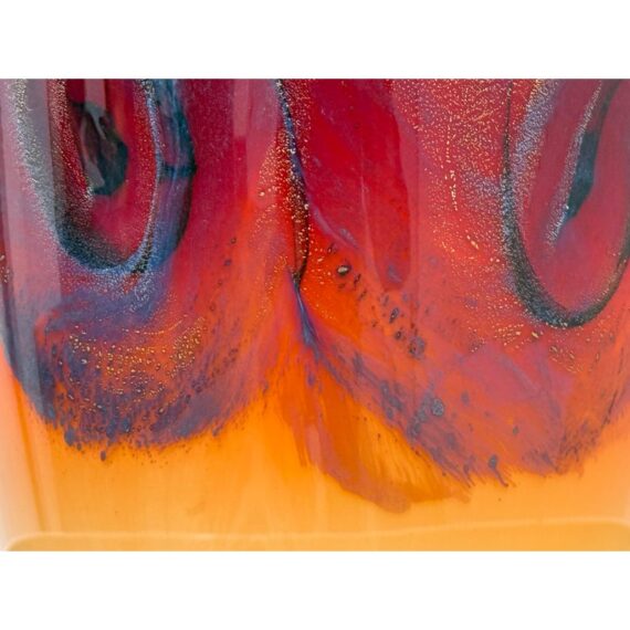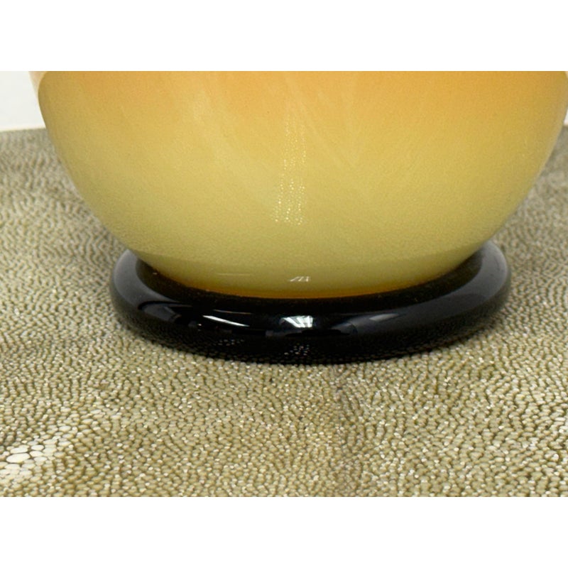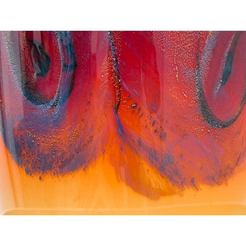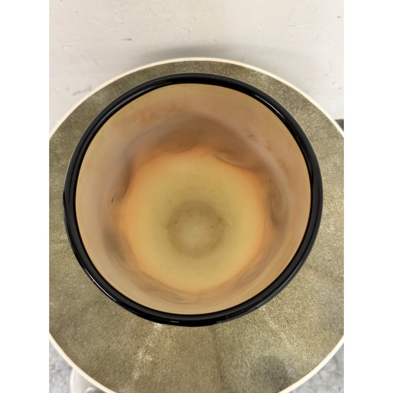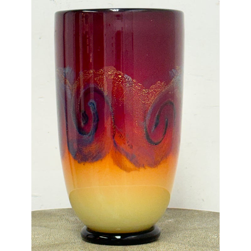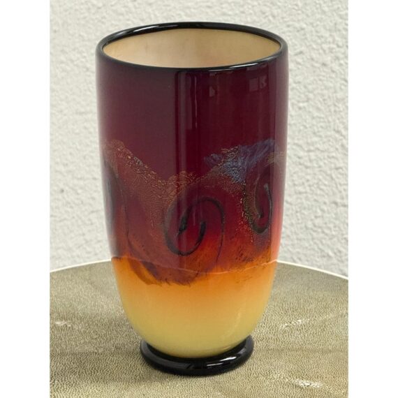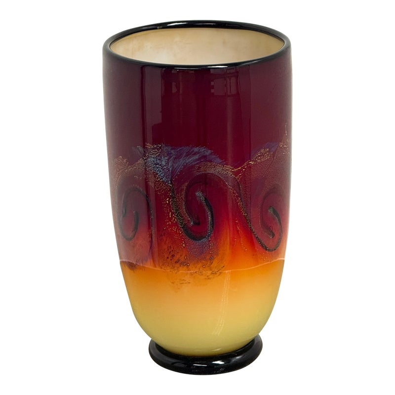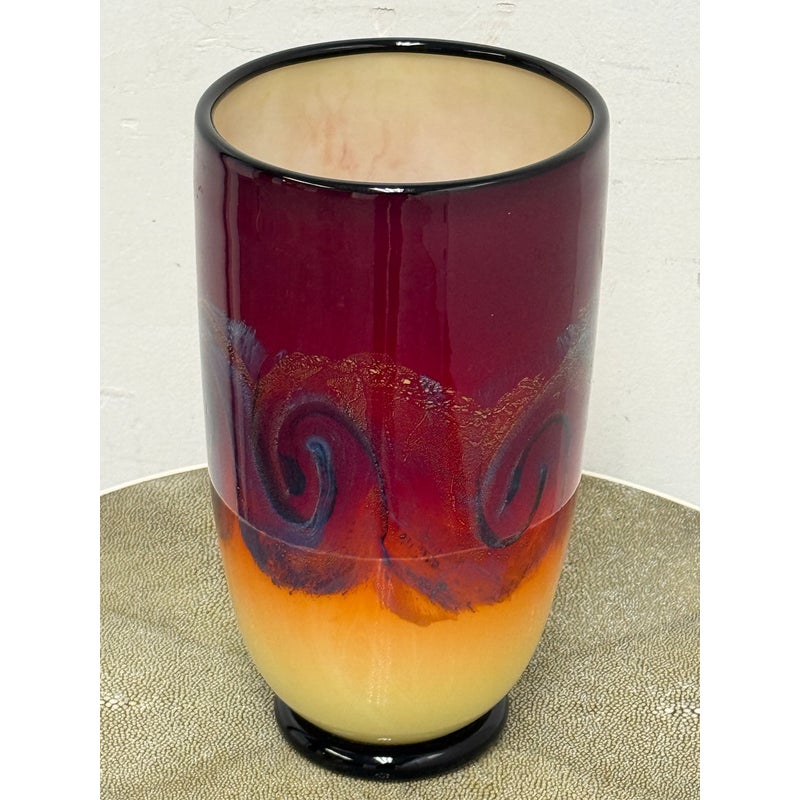 Design Plus Gallery presents a Handblown Art Glass by Nicholas Cash Nourot. A striking art glass vase featuring a rich ombré palette that transitions from warm amber to deep red tones. Subtle swirling accents add depth and movement, while the cylindrical form and polished rim lend a refined, contemporary feel. A bold decorative accent for a console, shelf, or tabletop. Condition is consistent with age and usage. Made in USA.