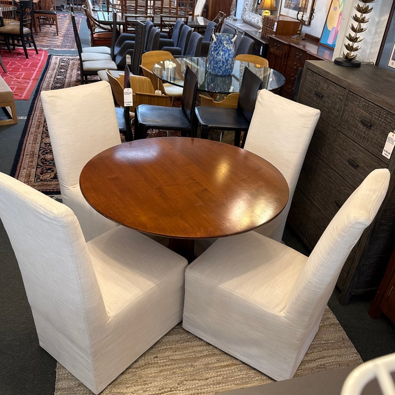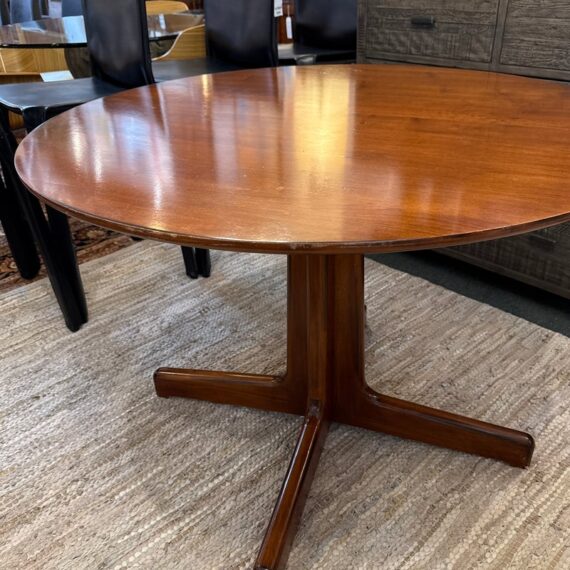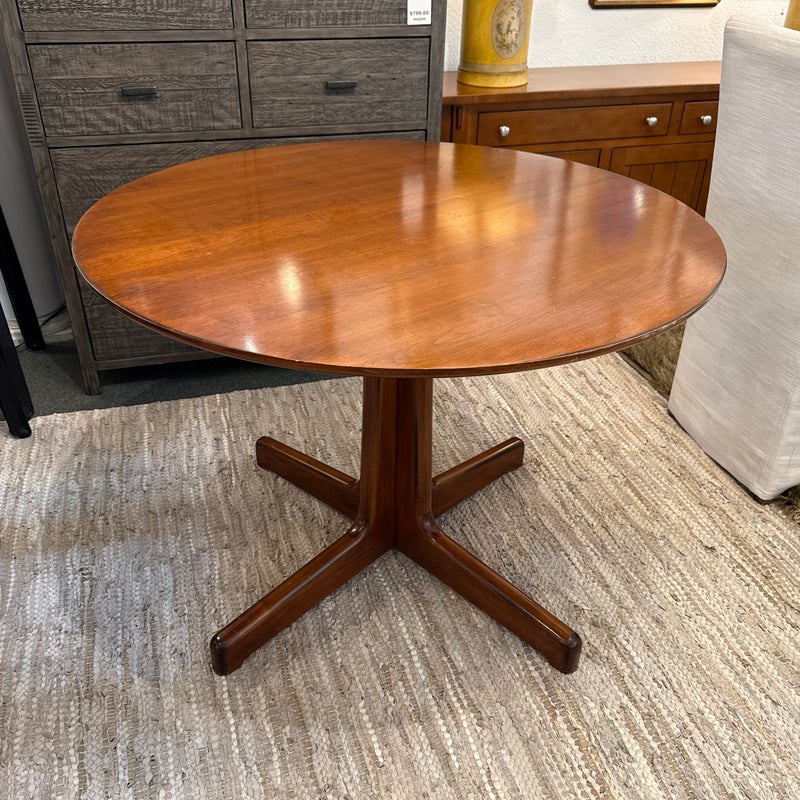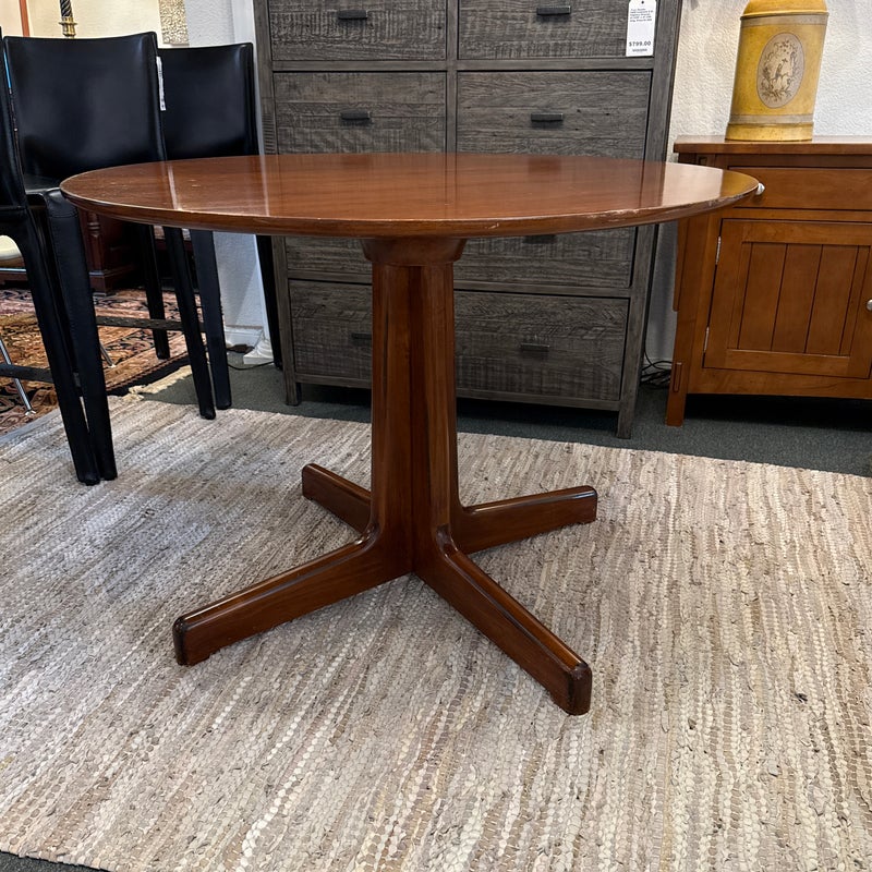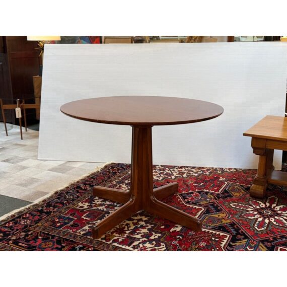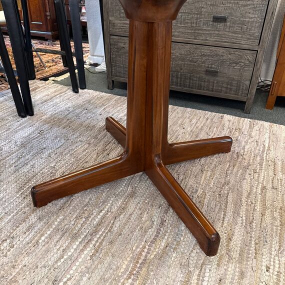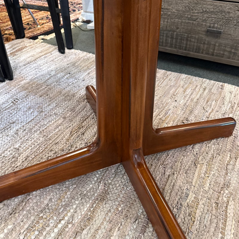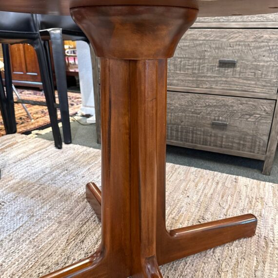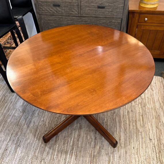 Design Plus Gallery presents a Pedestal Dining Table from Nichols & Stone. The dining table is made from solid wood and with a light Cherry Wood finish that allows the wood grain to be come through. The tables silhouette offers a slight nod to mid century with the splayed foot pedestal. Light surface wear; condition is consistent with age and use. Made in USA.