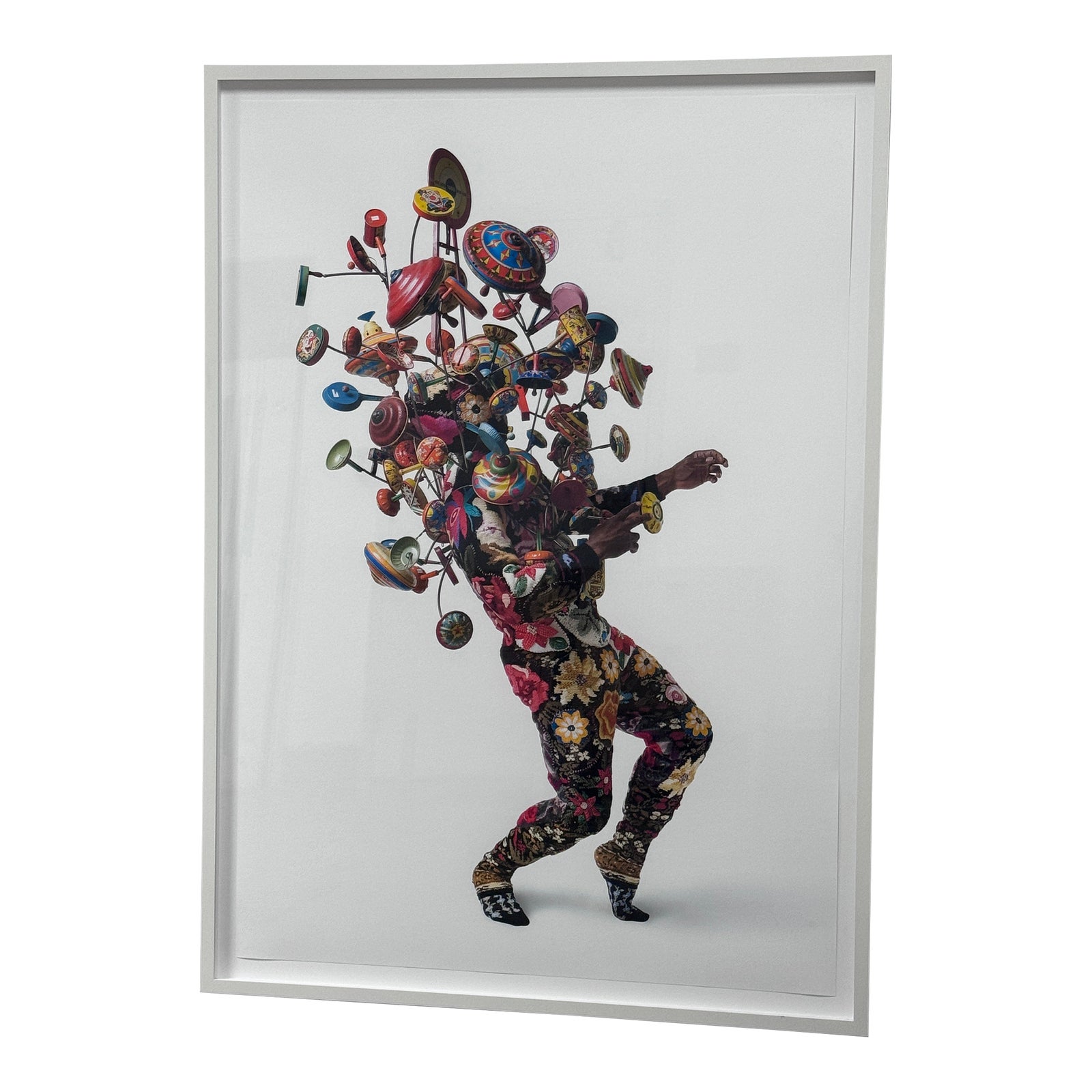 Design Plus Gallery presents a Limited Edition Print of Soundsuit #1 by Nick Cave. The color photograph is made with archival pigments on fine art rag paper with matte finish. Suggestive of both African ceremonial costumes as well as Parisian high fashion, Nick Cave’s Soundsuits were named because of the sounds they make when worn— Soundsuit #1 (tops) has a headpiece made entirely of vintage to antique metal spinning tops. These works combine Cave’s interests in fashion, culture, and the intersection of politics. By concealing their wearers’ race, gender, and class, Cave’s works allow individuals to escape or transcend prescribed identities. This print is a limited run from 2009 of just 20. This work comes with a Certificate of Authenticity. Is in good condition with minimal signs for wear.