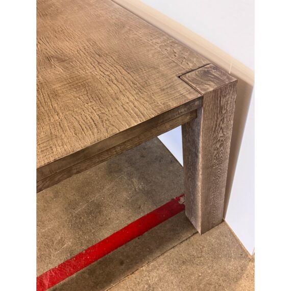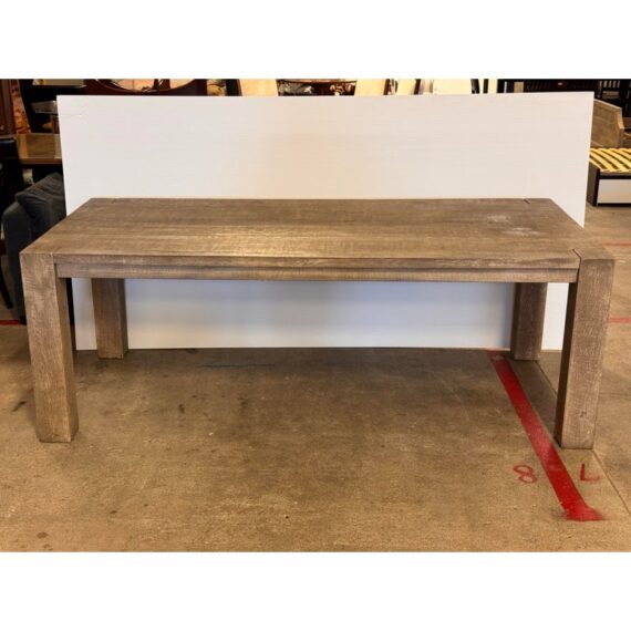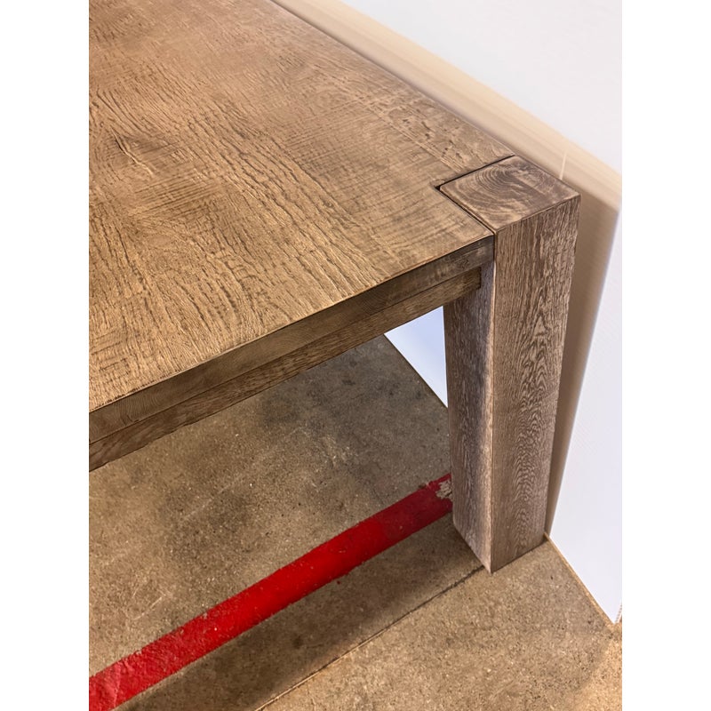 Design Plus Gallery presents a Parsons Dining Table by Nils Verhoeven for Restoration Hardware. Reclaimed oak wood from decades-old buildings in Europe lend character to this linear collection from designer and maker Nils Verhoeven. Each piece is handcrafted with a textured, wire-brushed surface that highlights the wood’s natural grain, along with the occasional knot, nick, or crack that speaks to its history. The drifted reclaimed grey oak stain enhances the depth and tonal variation of the material while maintaining the clean geometry of the Parsons silhouette. Thick, squared legs align seamlessly with the apron and top, creating a balanced, architectural profile defined by straight lines and substantial proportions. The solid construction and visible joinery reflect a focus on material integrity and enduring design. It is in good condition, visible and minimal wear from usage.