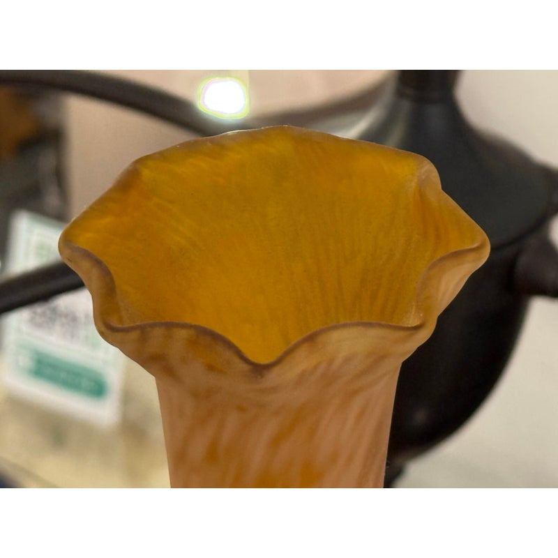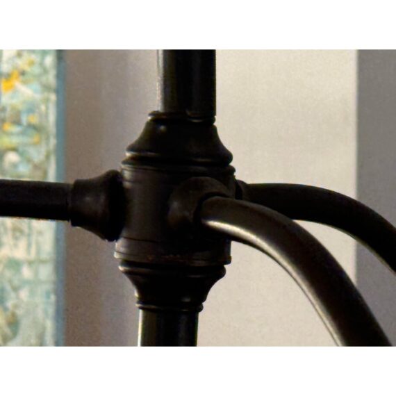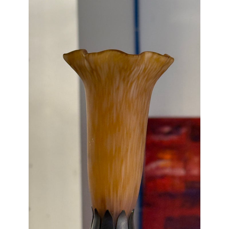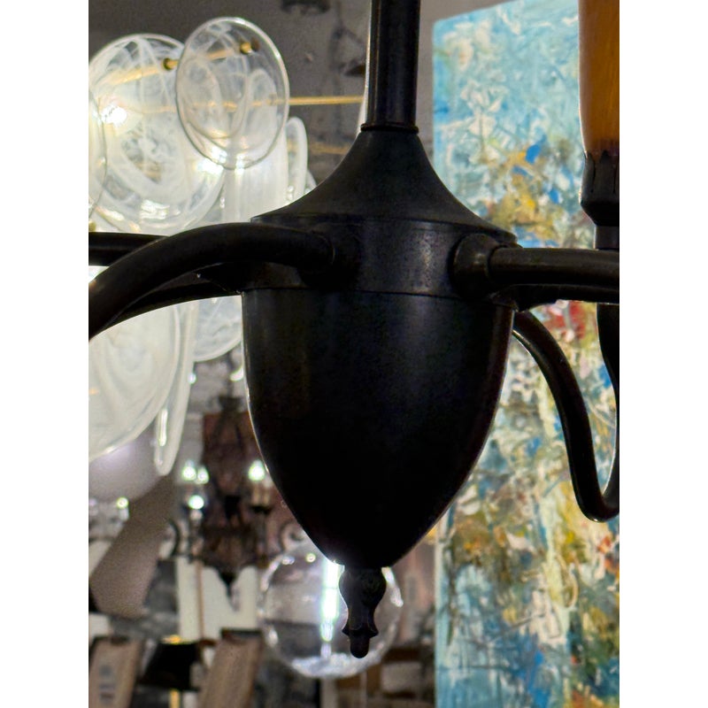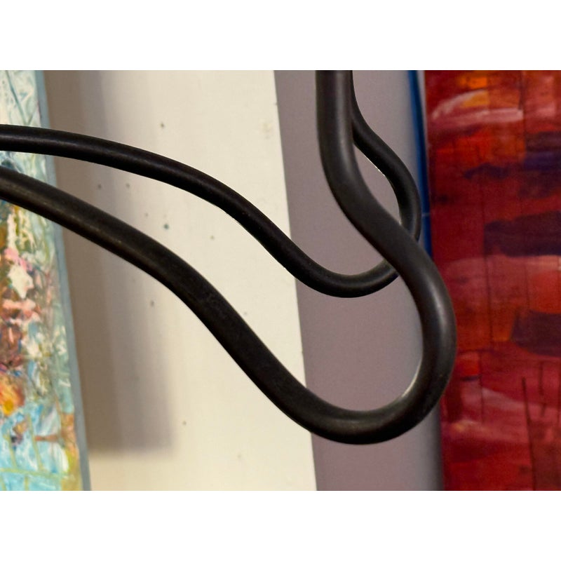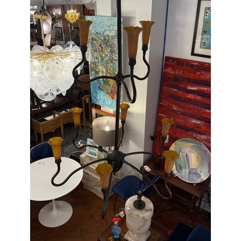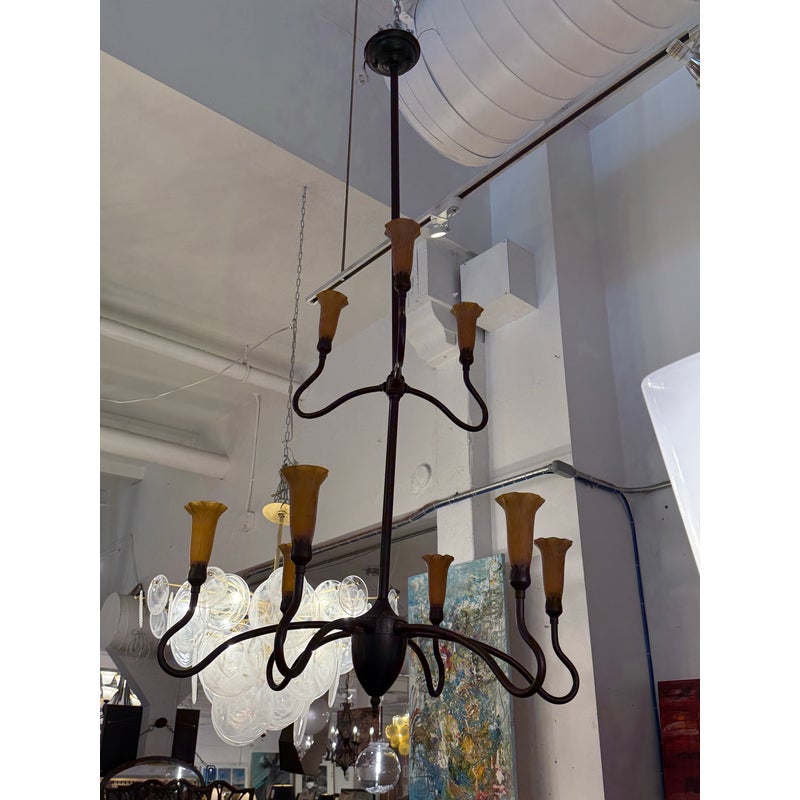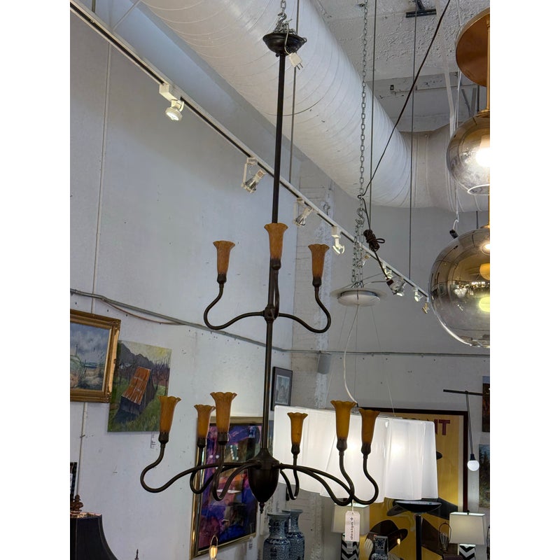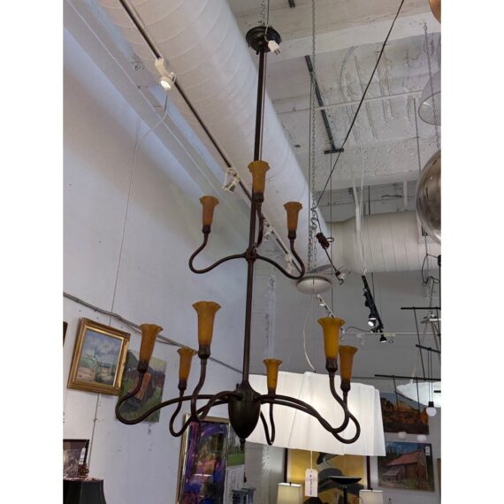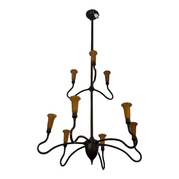 Design Plus Gallery presents the Two Tiered Elongated Chandelier. This nine-arm forged iron chandelier combines the drama of height with symmetry + organic flow to bring both presence + illumination to large spaces. The glass shades mimic alabaster tulip shapes resting atop shapely arms. Is in good condition for its usage.
