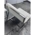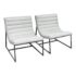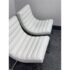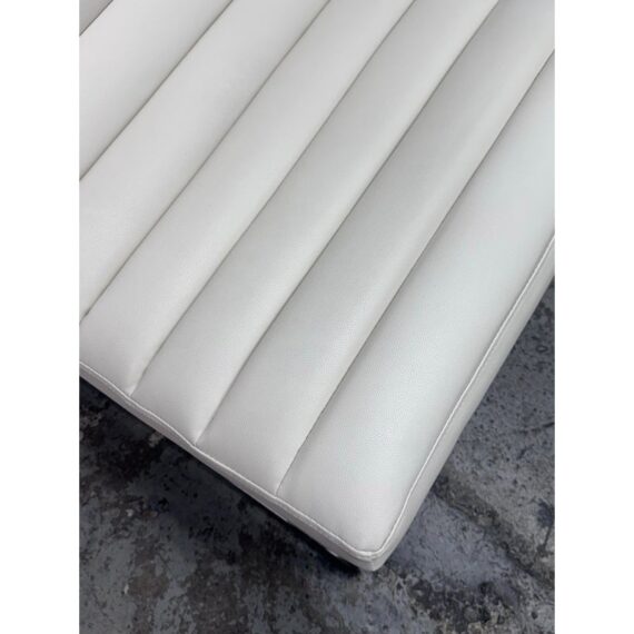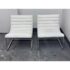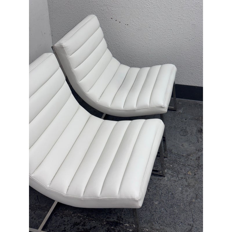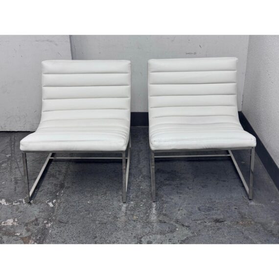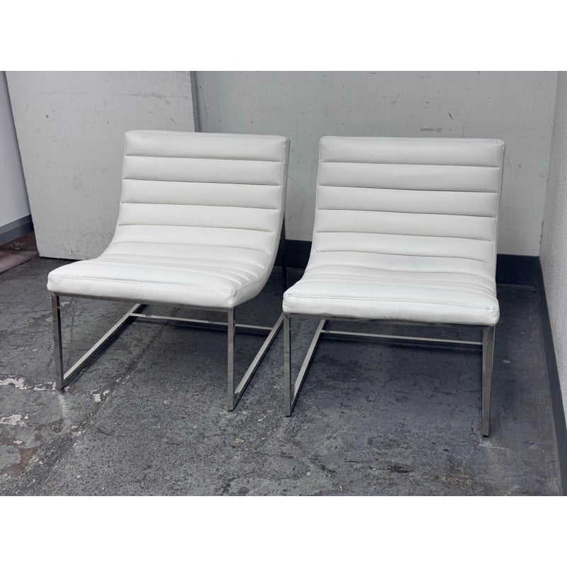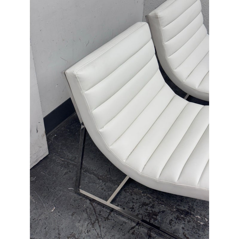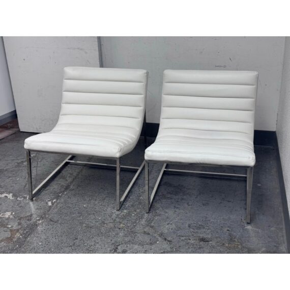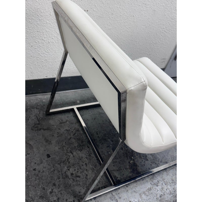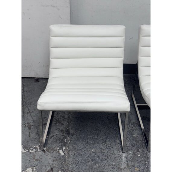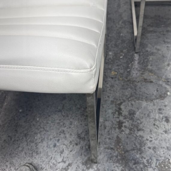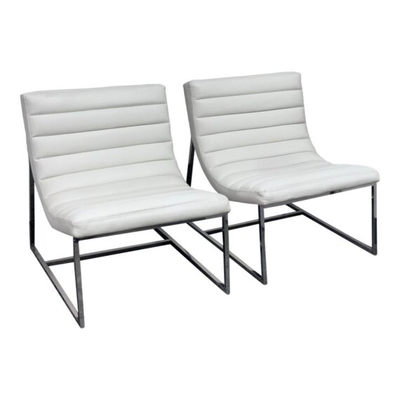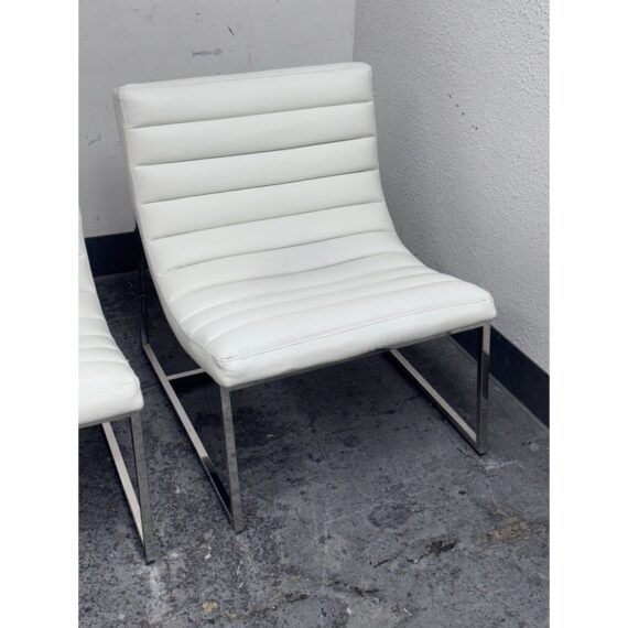 Design Plus Gallery presents a Pair of Taher Chairs from Noble House. Features a contoured and ribbed seat, upholstered in white leather. The seats rest gracefully on a shimmering geometric chrome metal frame, creating a captivating contrast and a cosmopolitan designer aesthetic. Both chairs are in good condition, with only minimal and visible wear from usage, reflecting their quality and enduring appeal. These are discontinued models. In good condition, visible and minimal wear from.