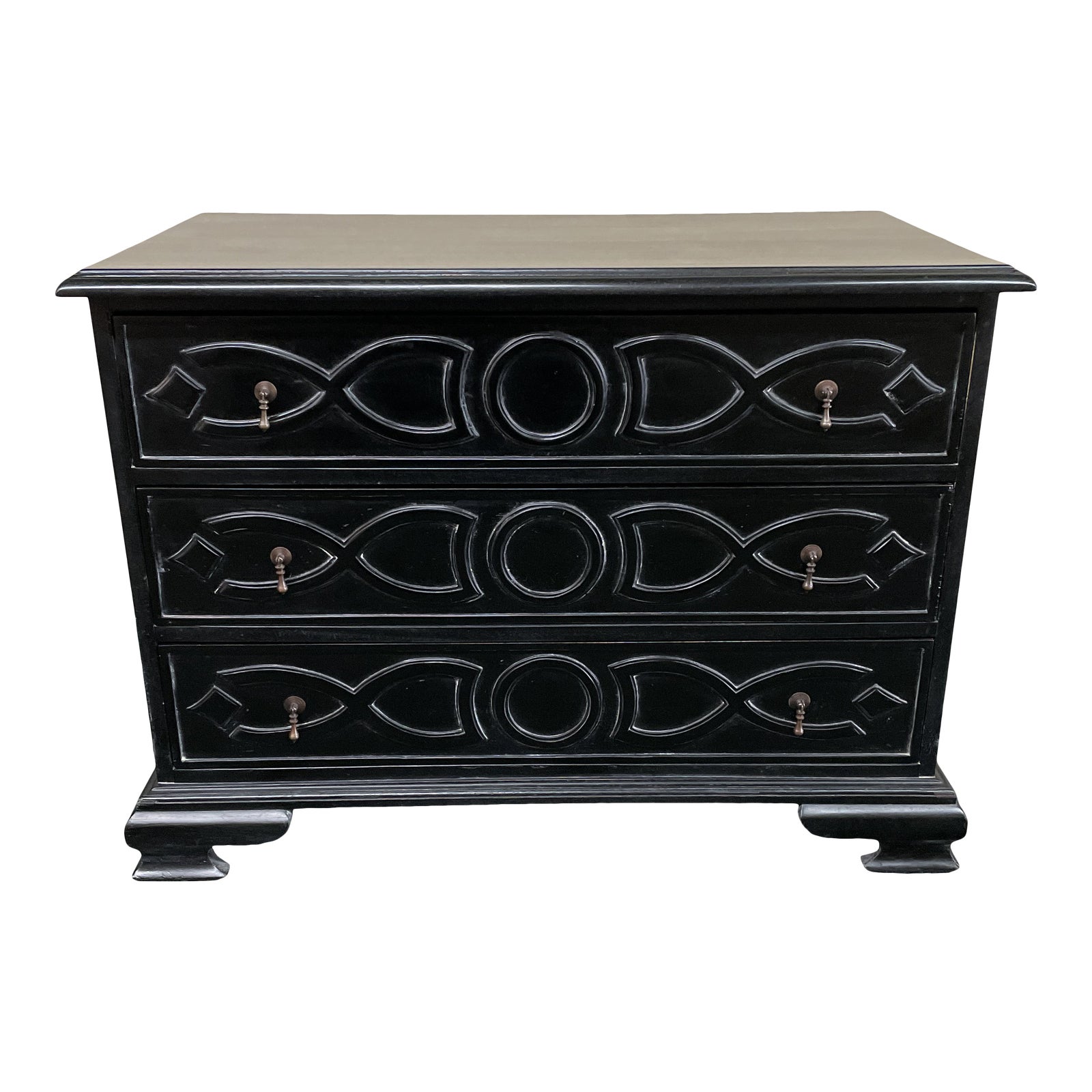 Design Plus Gallery presents the Sofie Three Drawer Dresser by Noir. Lovely scale for bedside or otherwise, mahogany wood with rich black hand rubbed finish is striking with the beveled drawer front detail and carved feet. Antiqued brass pulls open to reveal a trio of deep drawers offering plenty of storage.