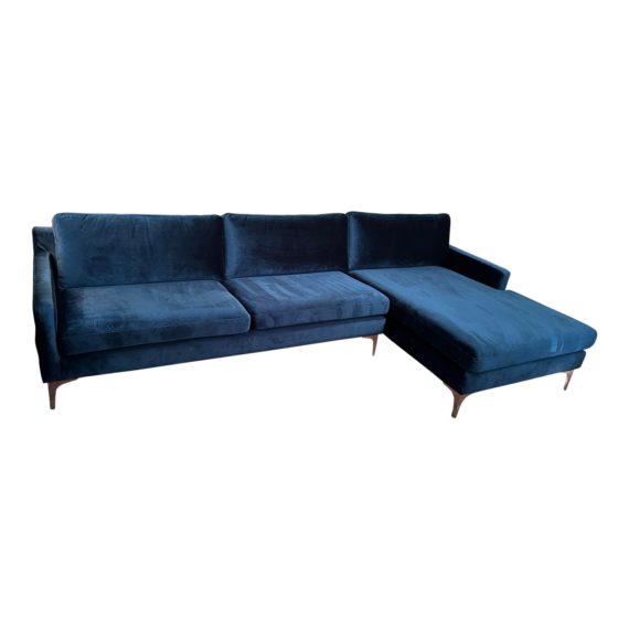 Design Plus Gallery presents a Nuevo Living Anders Sectional Sofa in Midnight Blue. A two piece sectional is upholstered in a luxurious Midnight Blue velvet, adding a touch of sophistication to any living space. The sectional consists of a left arm facing sofa and a right arm facing chaise lounge, allowing you to stretch out and relax in ultimate comfort. The clean lines of this sectional create a sleek and modern look, while the plush cushions provide a welcoming and cozy feel. Whether you are entertaining guests or simply lounging around on a lazy day, this sectional is designed to make you feel right at home. The steel legs also provide stability and support, ensuring that your sectional will remain in great condition for years to come. Its inviting profile, plush cushions, and sleek design combine to create a stylish and comfortable seating option that you will love to relax on. Minor wear. Made in Vietnam.