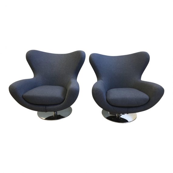 Design Plus Gallery presents a Pair of Conner Lounge Chairs by Nuevo living. A plush, comfortable inviting tailored chair upholstered in a wool Gray fabric. A polished stainless steel 360 degree swivel stem and base. Arm Height: 23 inches, Set Height 17 inches.