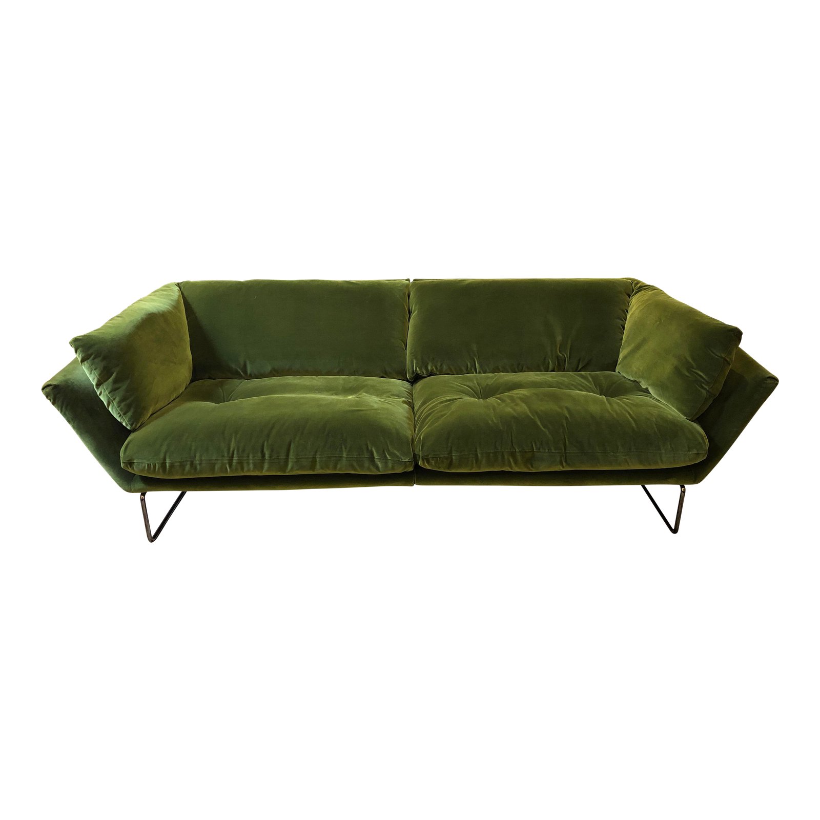 Design Plus Gallery presents the NY Studio Loria Sofa by H.D. Buttercup. Luscious in grass green velvet, the contemporary lounger invites relaxation. Beautifully angled arms and a rubbed nickel base keep the silhouette clean, the tufted foam & feather filled seat cushion and wraparound back cushion are all about comfort.