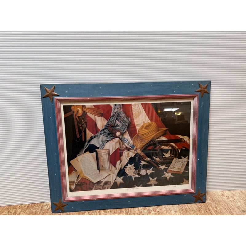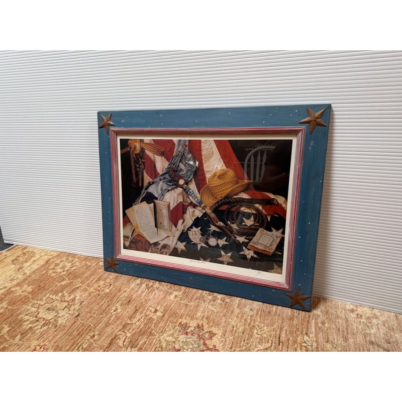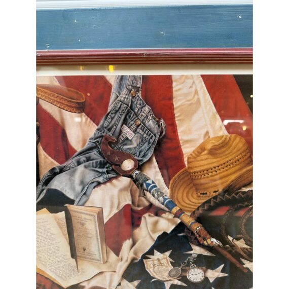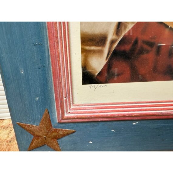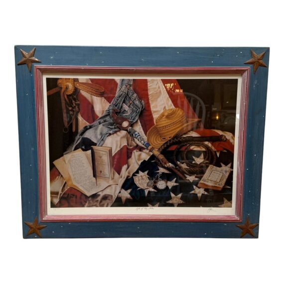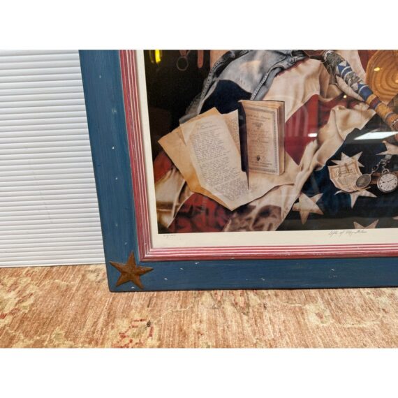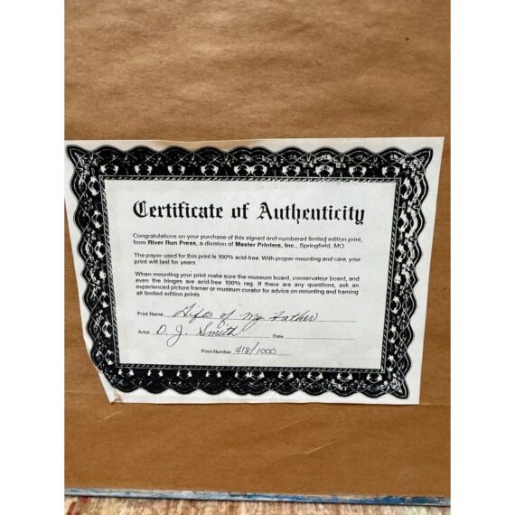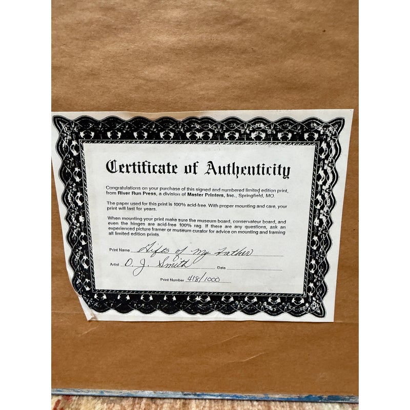 Design Plus Gallery presents “Gifts of My Father” a limited edition print No. 418/1000 signed by artist O.J. Smith. Printed by River Run Press, the lovely nostalgic composition speaks to the life and service of a loved one. Professionally matted and framed to great effect. Condition is good.