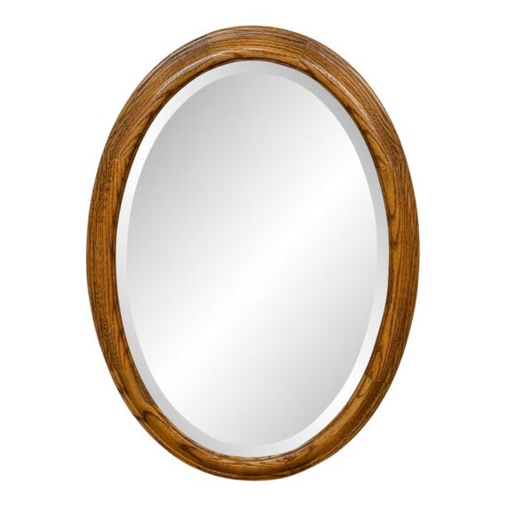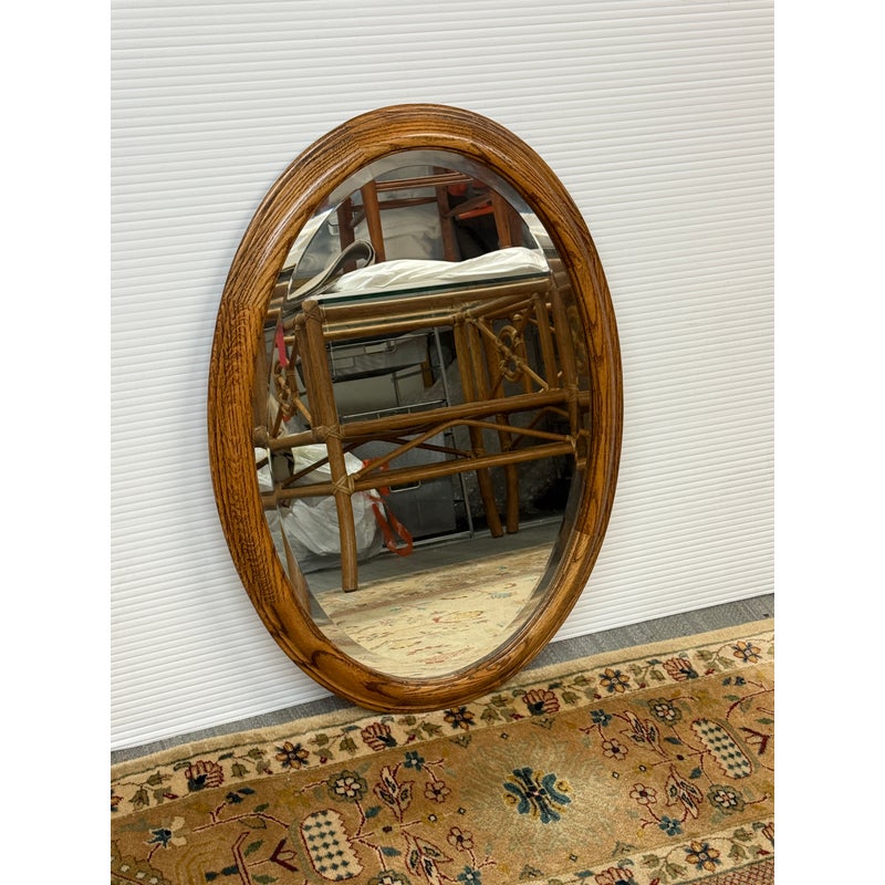 Design Plus Gallery presents a Late 20th Century Oak Wood Wall Mirror. The mirror has a beveled edge and is encased in a thick, oak wood frame that radiates warmth and shows off its magnificent grain texture. The mirror shows minimal signs of visible wear and is in good overall condition.