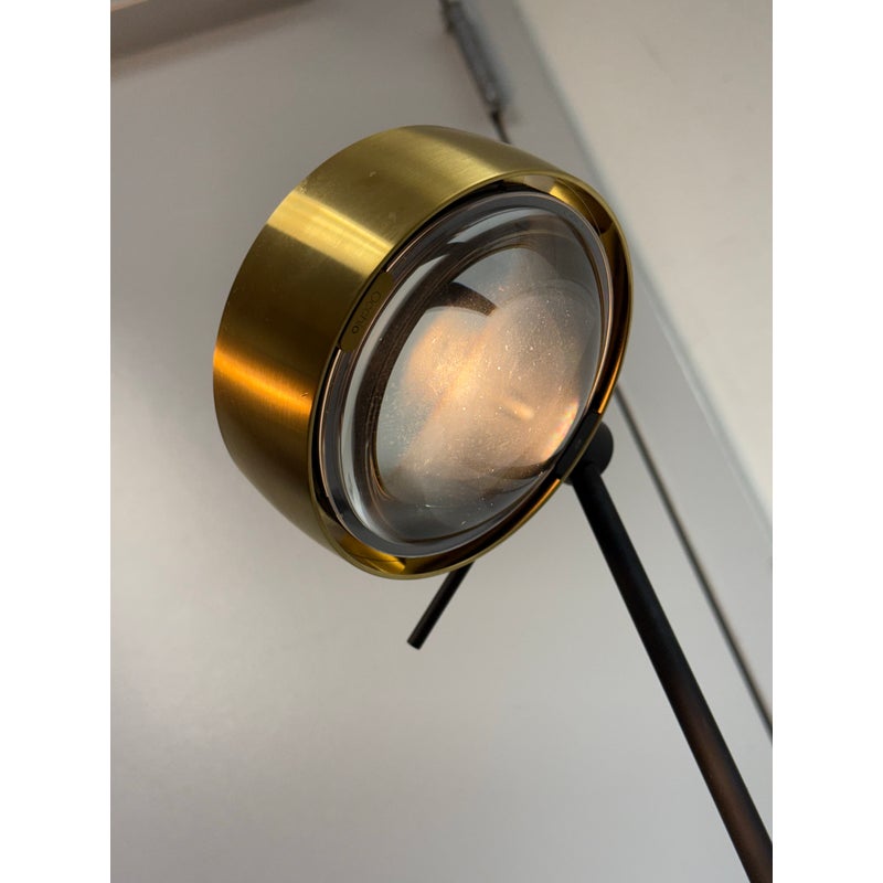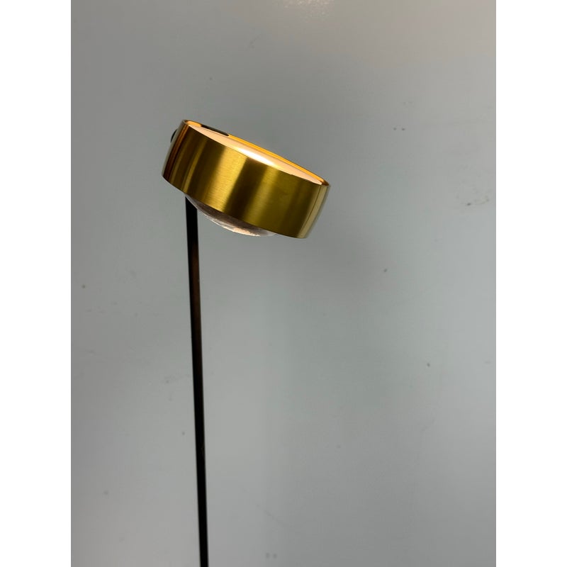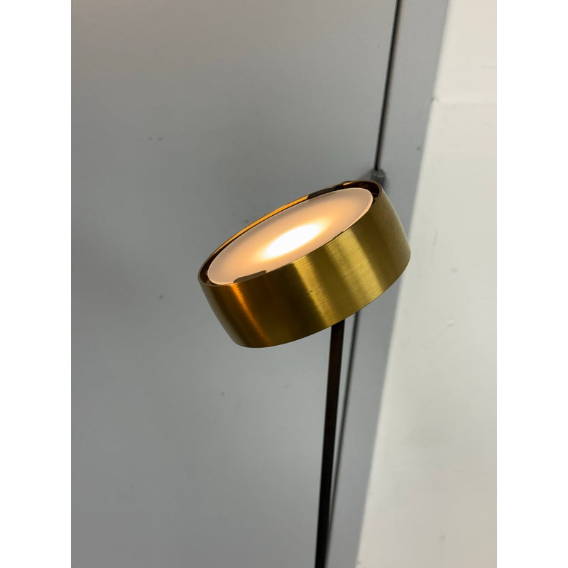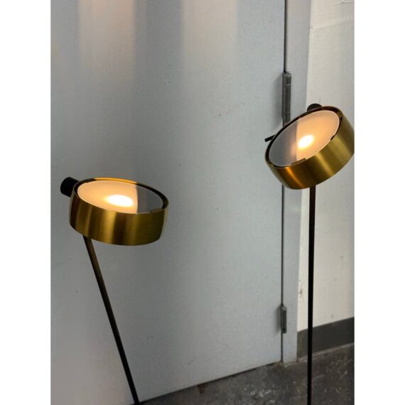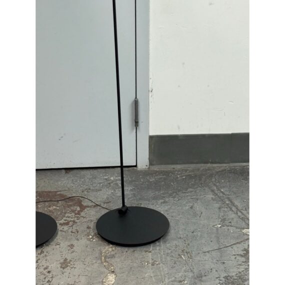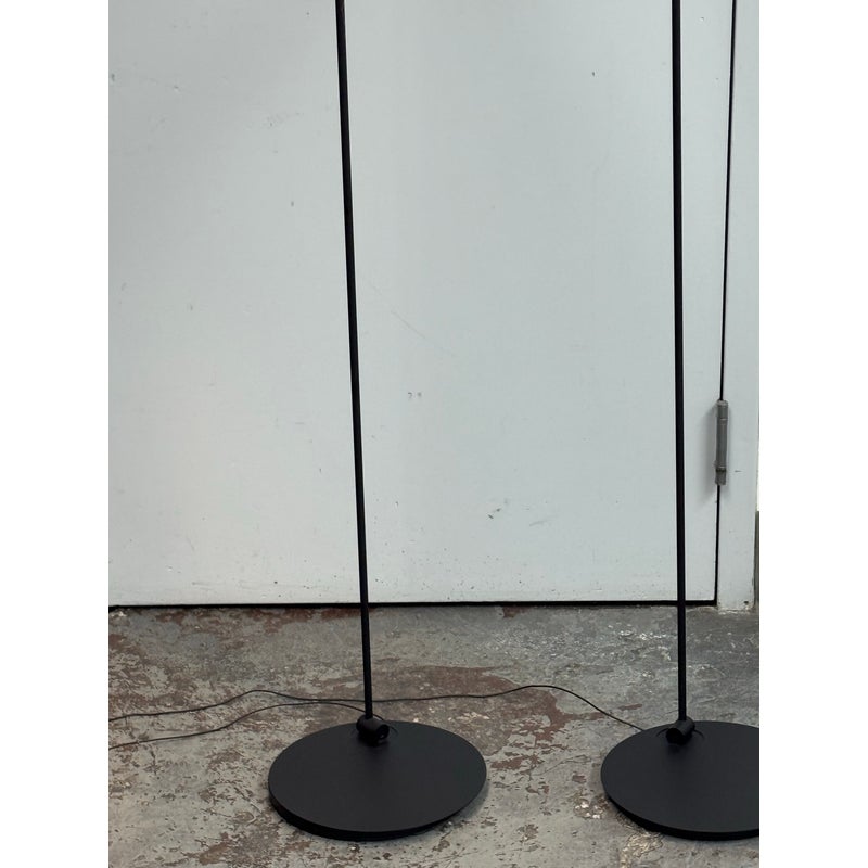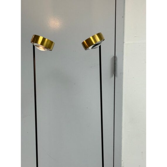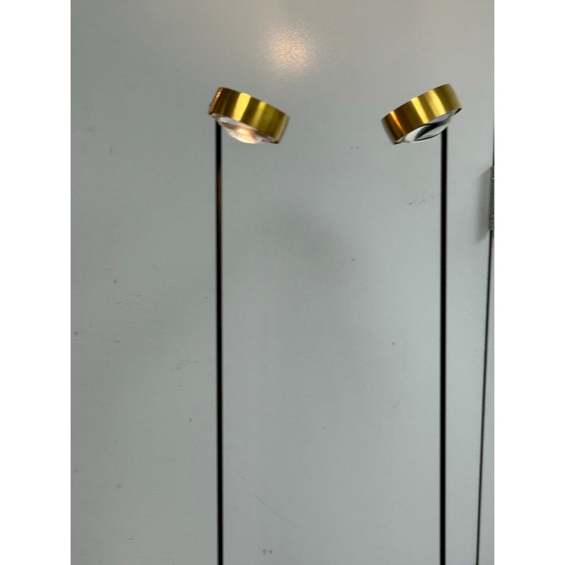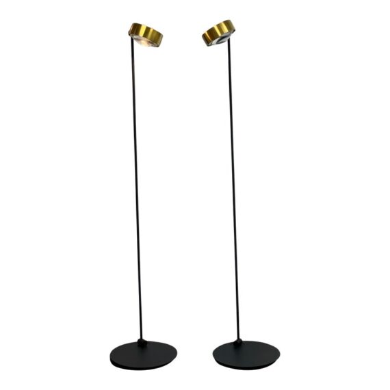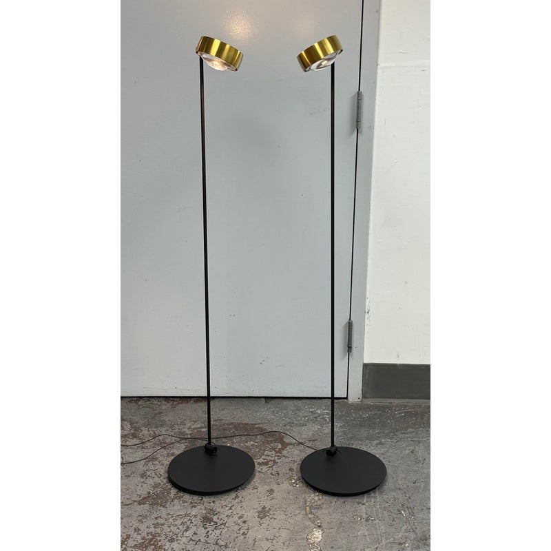 Design Plus Gallery presents a Pair of Sento Floor Lamps from Occio. Sento is a collection full of charm and elegance. They do not just illuminate the spaces but furnishes them and fills them with beauty, creating atmosphere. The collection has a well-defined character, thanks to the gold satin finish + matte black body. Their bodies are as malleable as its light fixture with its ability to stay fixed and straight, or leaning slightly. These Sento floor lamps are in good condition for their use + age.