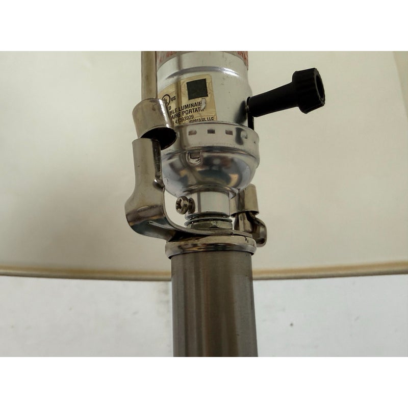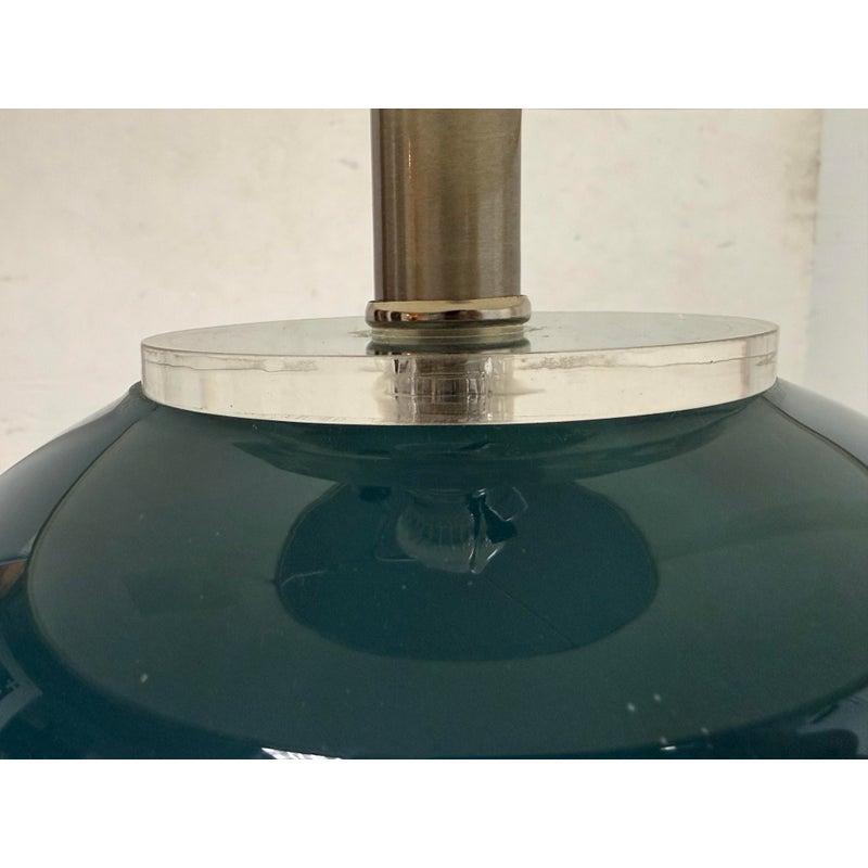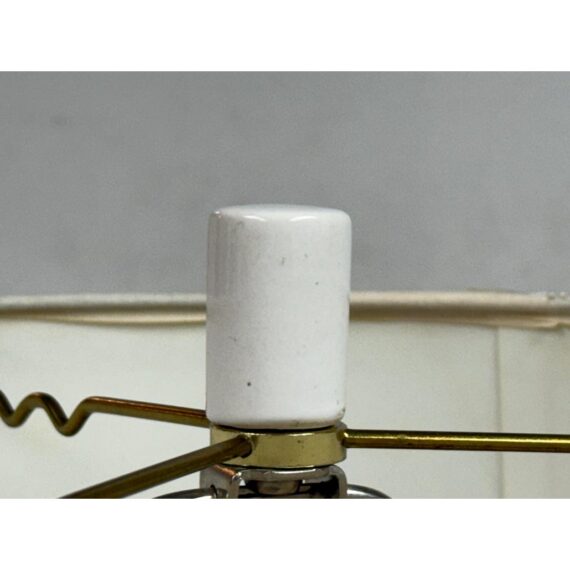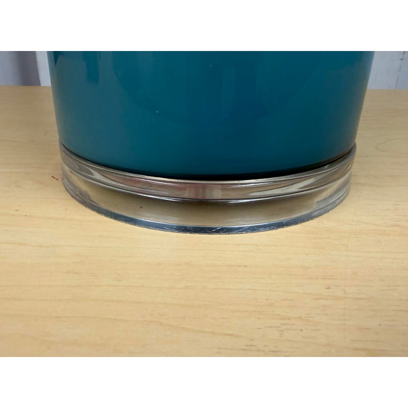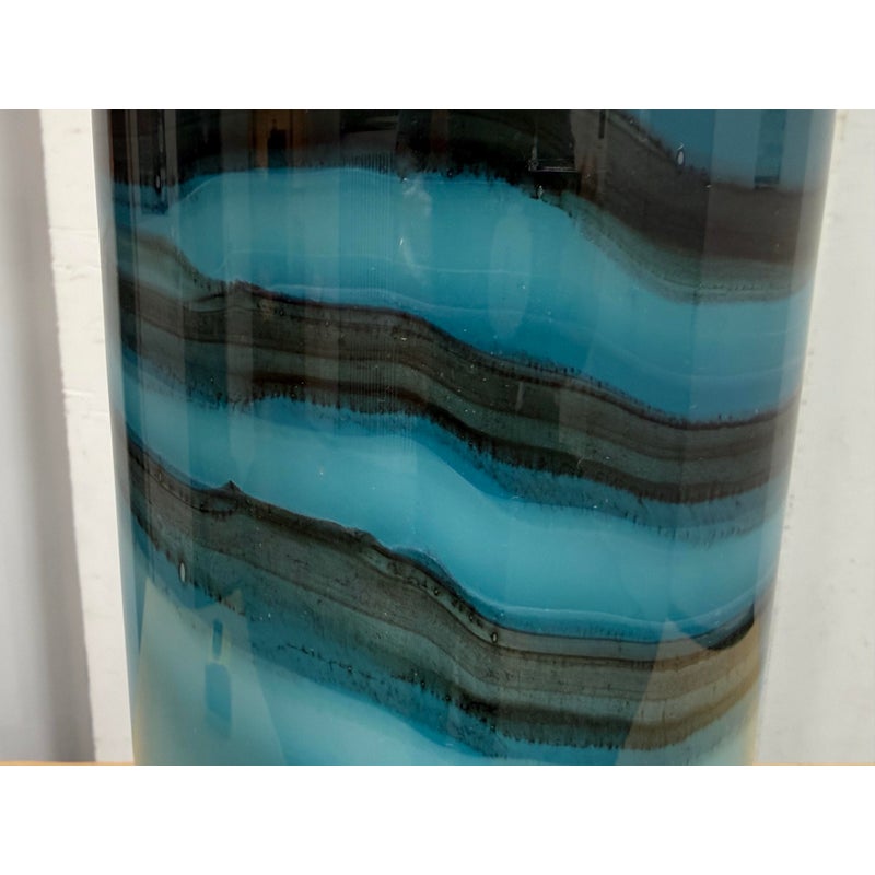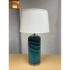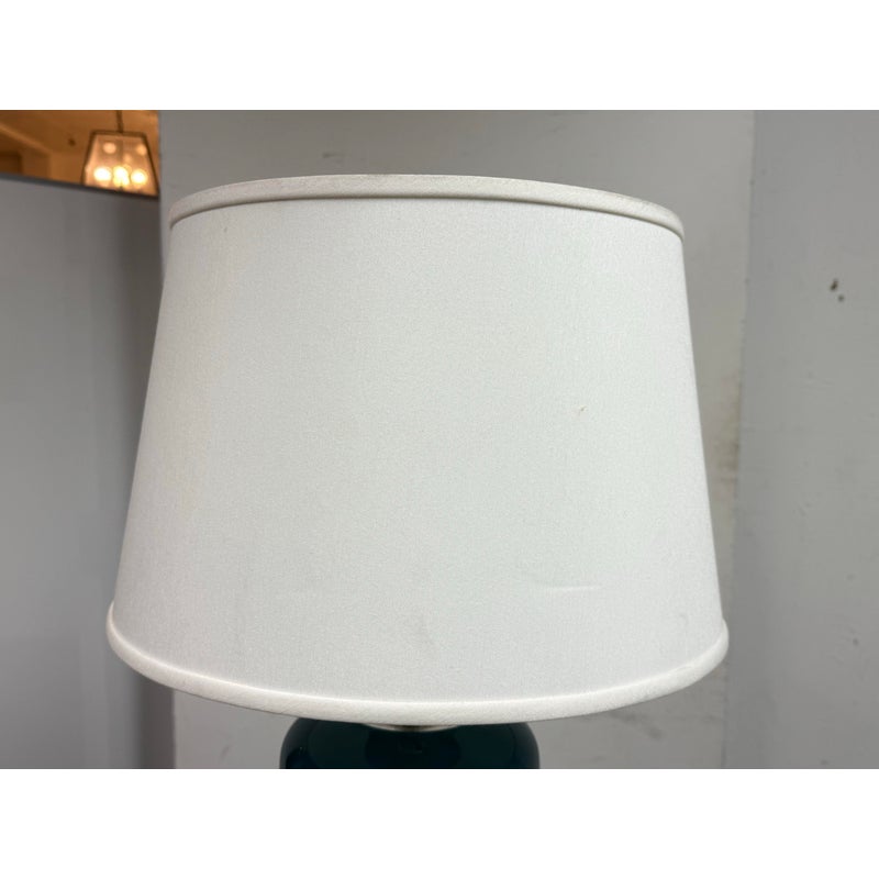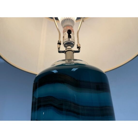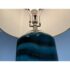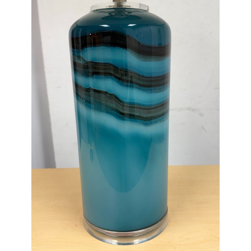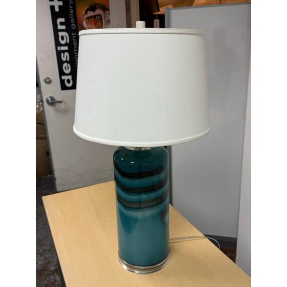 Design Plus Gallery presents an Oceanic Blue Table Lamp. The style is eclectic and has deep blue colors of teal and navy taking over its cylindrical body. There is a white lamp shade and a white finial to top it. Overall the lamp is in good condition with minimal visible wear for its usage.