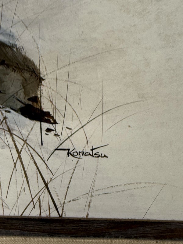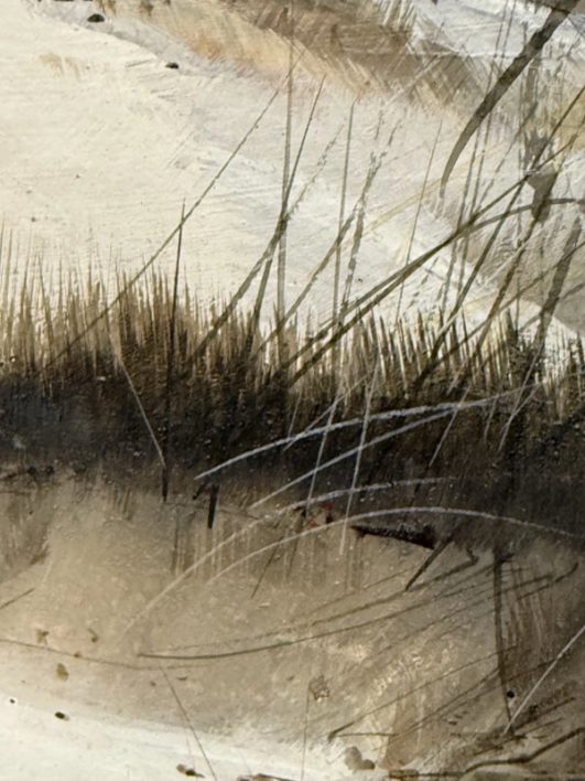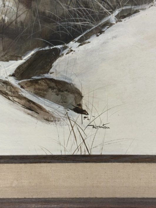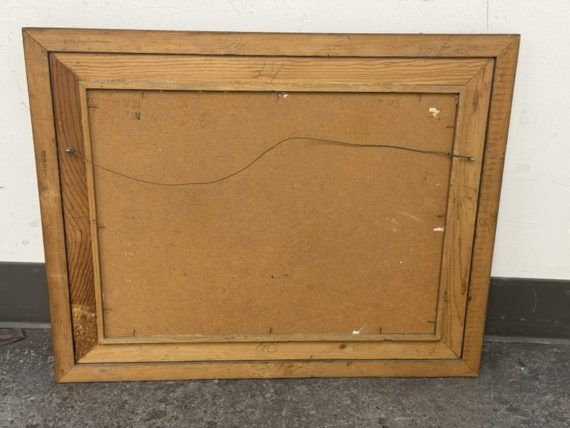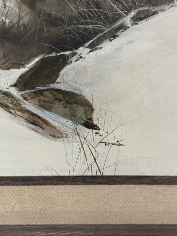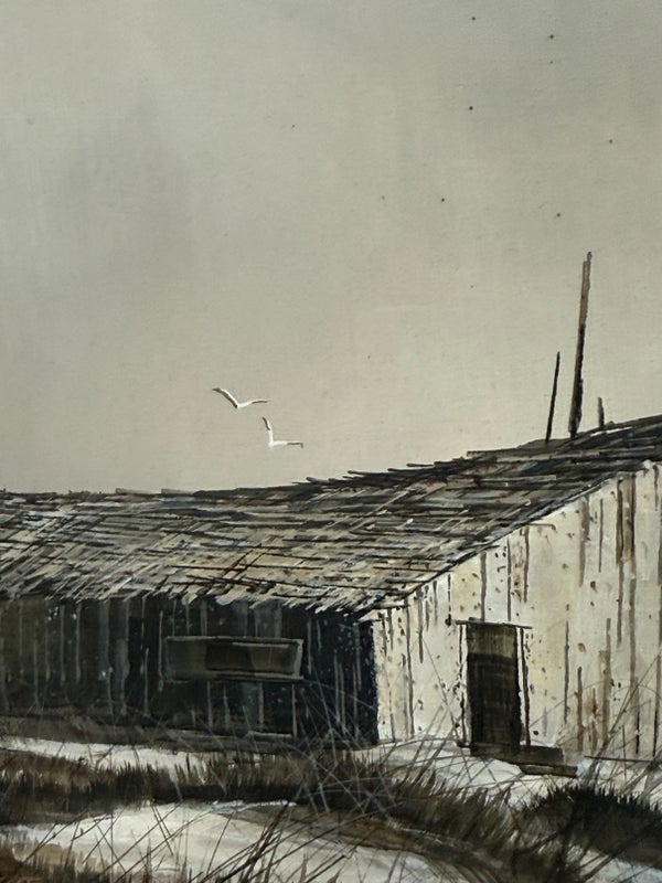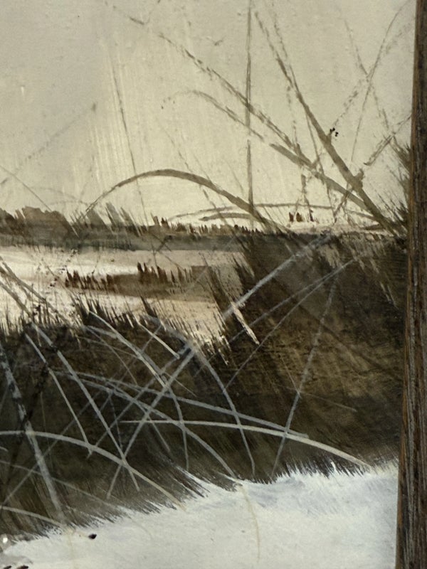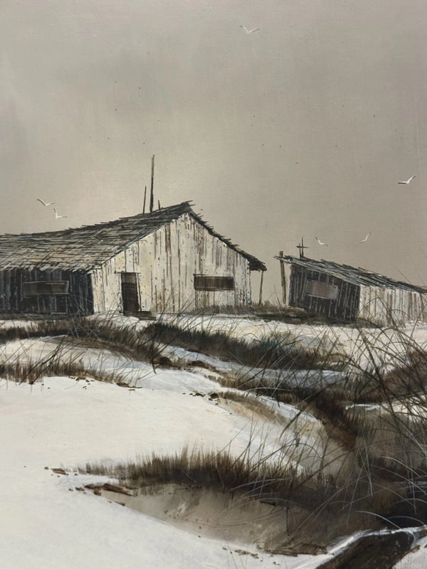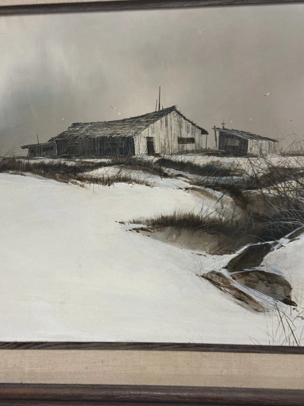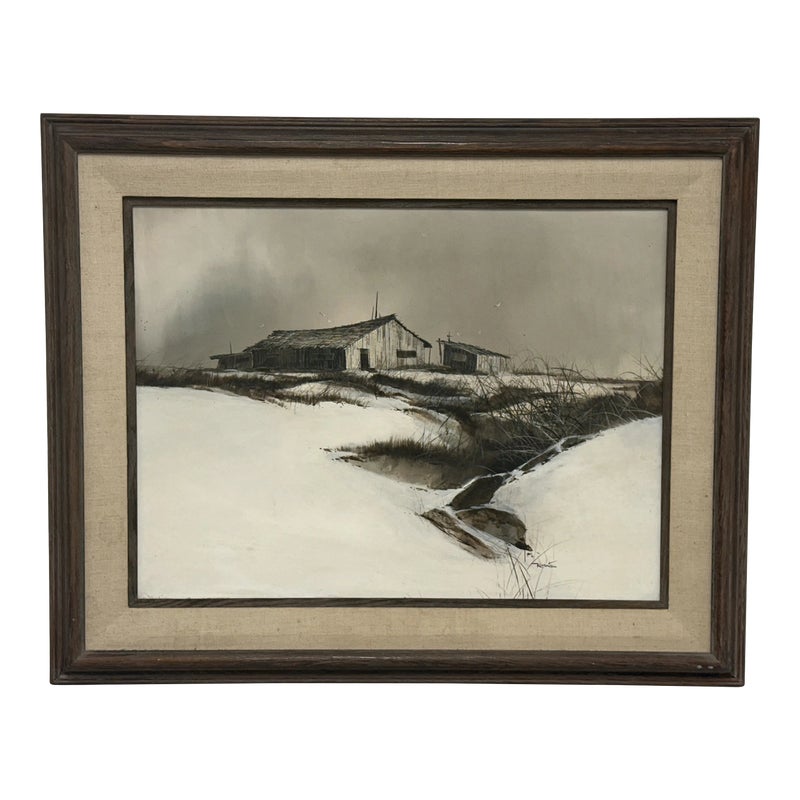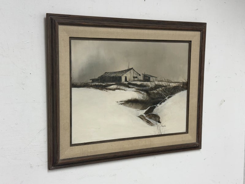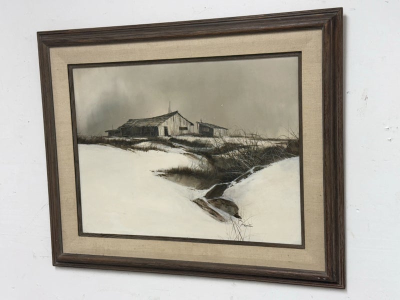 Design Plus Gallery presents an Unknown Arts Oil on Canvas Panel Artwork. The piece shows winter in all its delicateness shows a snow covered trail leading up to a barn. Is in a wooden frame with linen matter and of vintage age. Is in good conduit for its age + use.