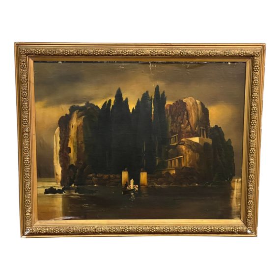 Design Plus Gallery presents a cope of Arnold Böcklin’s ‘The Isle of Dead’. Though obscure today it had been one of the most popular paintings in all of Europe in the 1930s. The work features a small, shadowy island dotted with cypress trees, replete with a stone seawall and entryways and ramparts built into the towering cliffs. Approaching from the water is a small boat, carrying a boatman, as well as a coffin and figure both shrouded in white with this final detail being added at Berna’s request. The boat and the figure at its helm have drawn comparisons to Charon, the ferryman from Greek mythology who would take the souls of the dead across the River Styx to Hades. It is a quiet and austere composition, seeming to beg as many questions as it answers. This is a copy from an accomplished oil pointer that was trained to faithfully execute copies of famous paintings in museums. This copy has surface wear and is missing the glass to protect the canvas from the elements, but is in fact a high-quality representation of its original. Visible conditions and wear from usage + age.