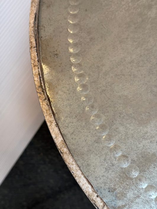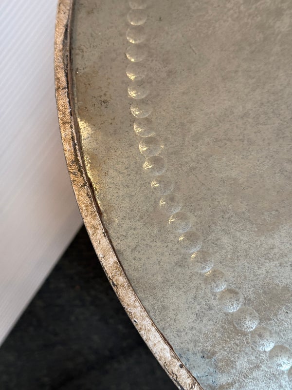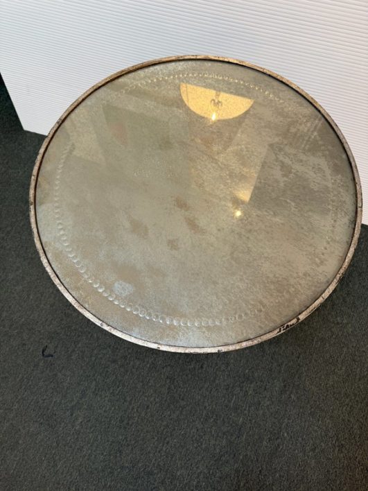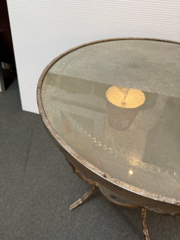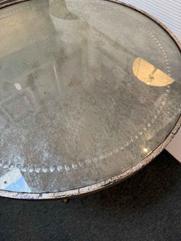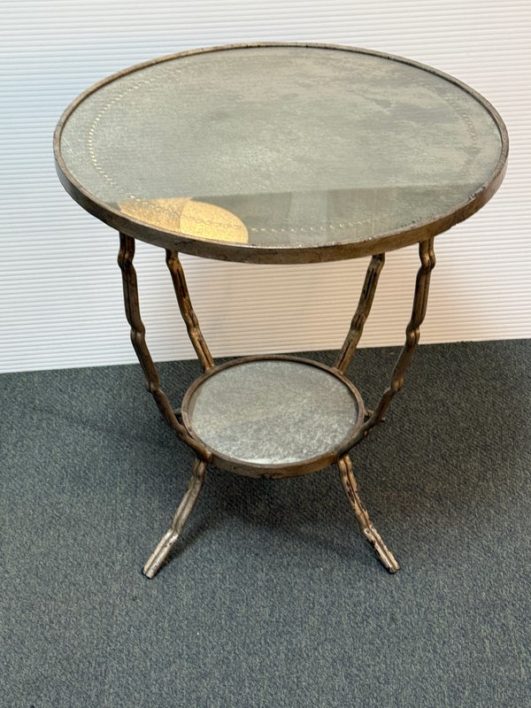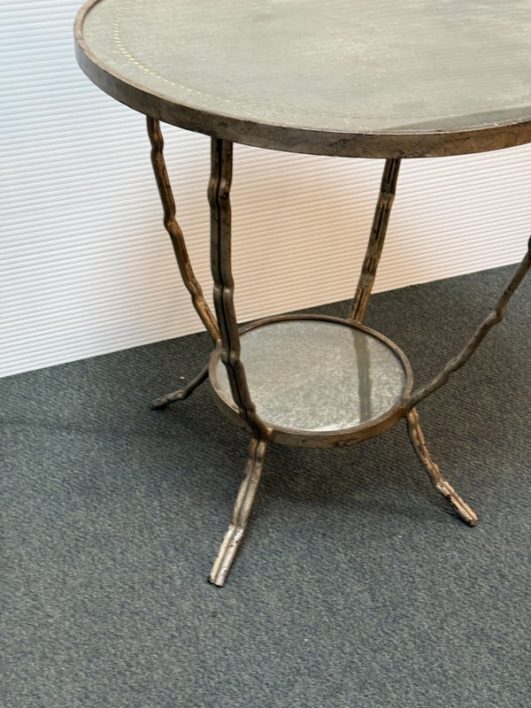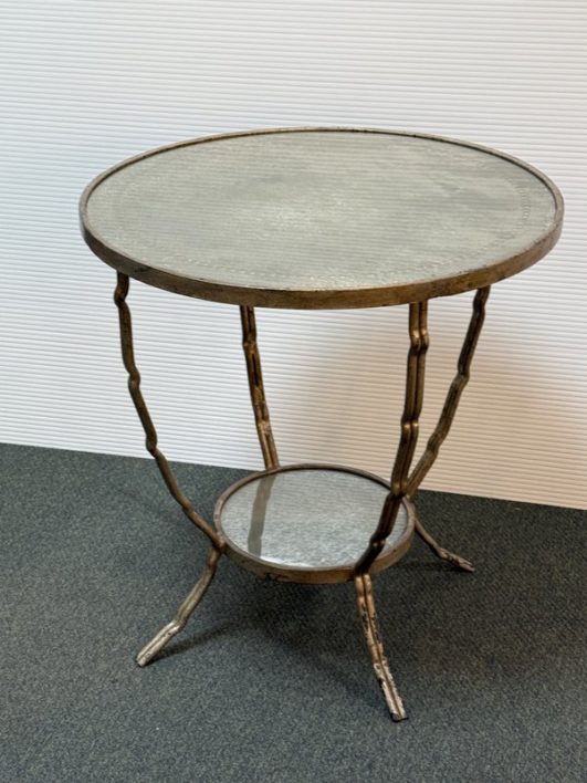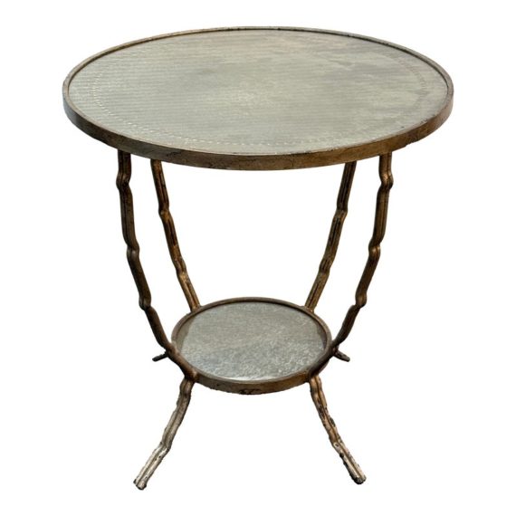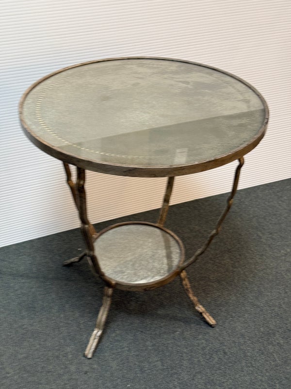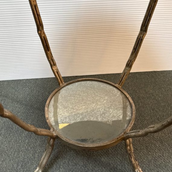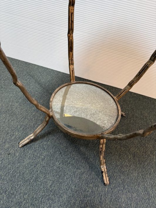Design Plus Gallery presents a Antiqued Brass Gueridon Side Table by Oly Studio. Twisted twig-like brass finished base supports a pair of classic eglomise mirrored glass rounds for an elegant and light table for chair or bedside. Antiqued finish is intentional; Light surface wear; condition is consistent with age and use.