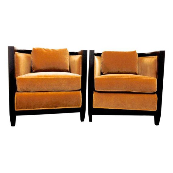 Design Plus has pair of brand new Barrel Chairs form designer darling Oly Studio. These Chairs are stained in a espresso finish and upholstered with carmel mohair fabric.