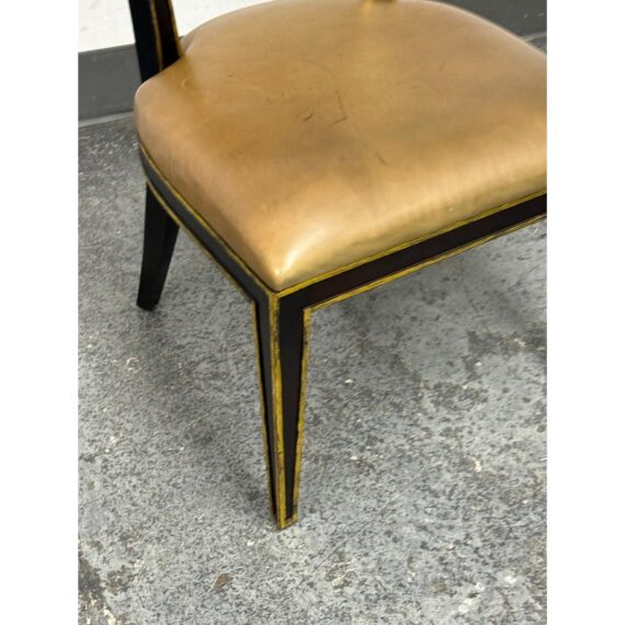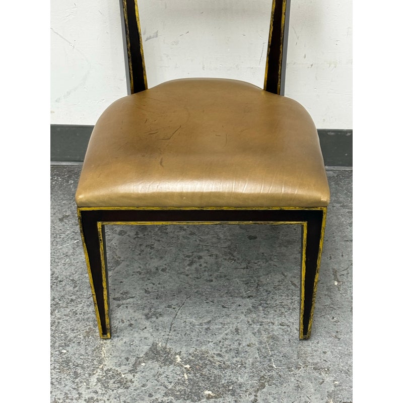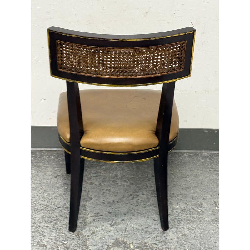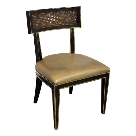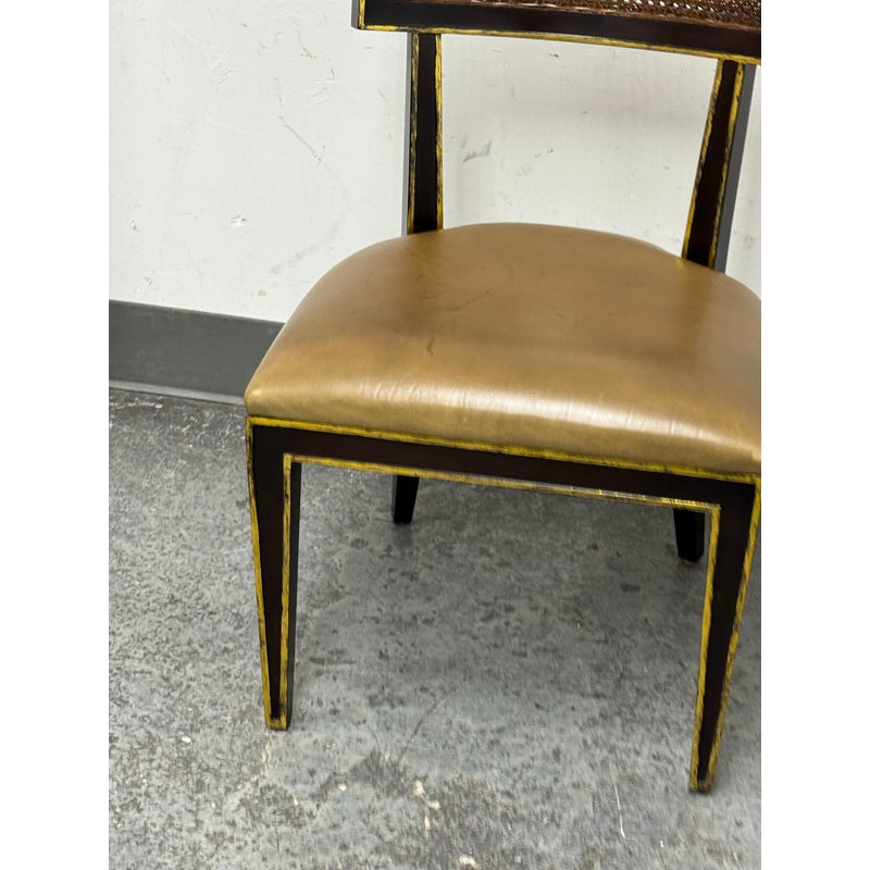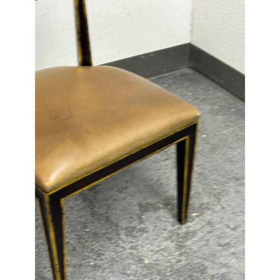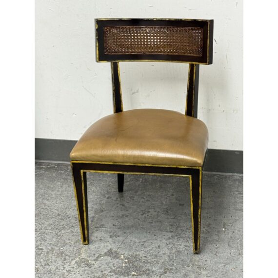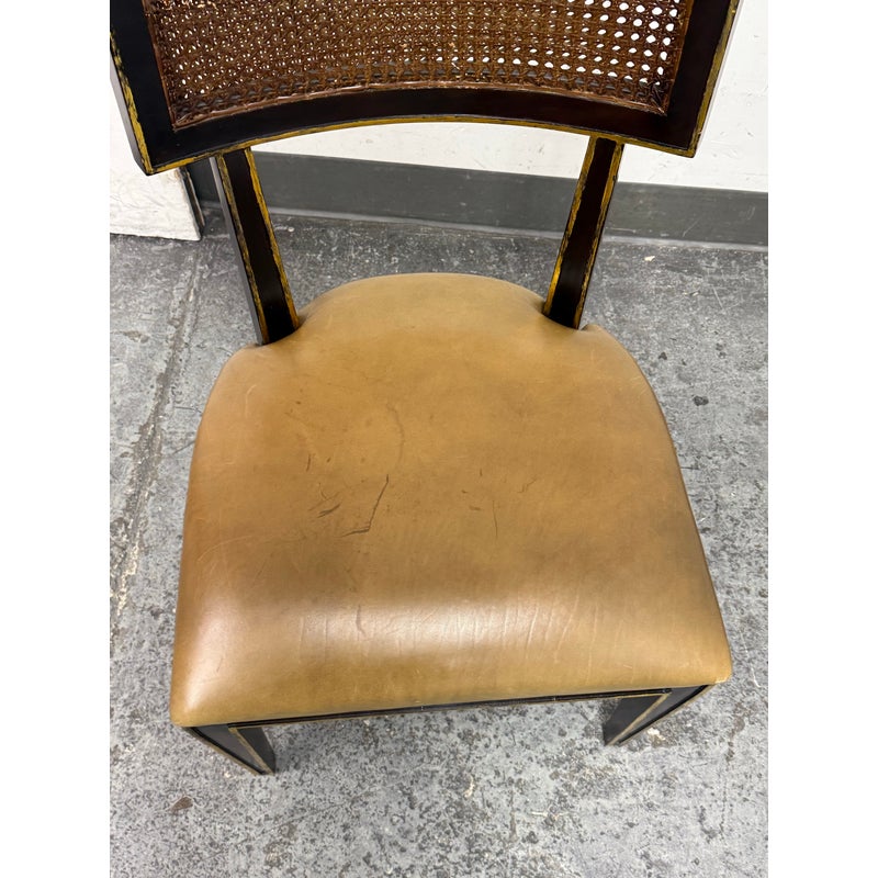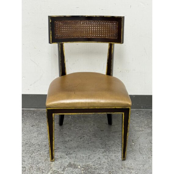 Design Plus Gallery presents the Courtney Side Chair Designed by Oly Studio. The Courtney chair has a distressed style that evokes old world charm in the best way. Its hardwood frame retains its simplicity with clean lines and a curved back. Enjoy its comfortable seating with a bronze leather upholstered seat and breathable cane back. Is in good condition for its use, visible finish on cane has rubbed off. This is a discounted model. No makers mark. Made in Indonesia.