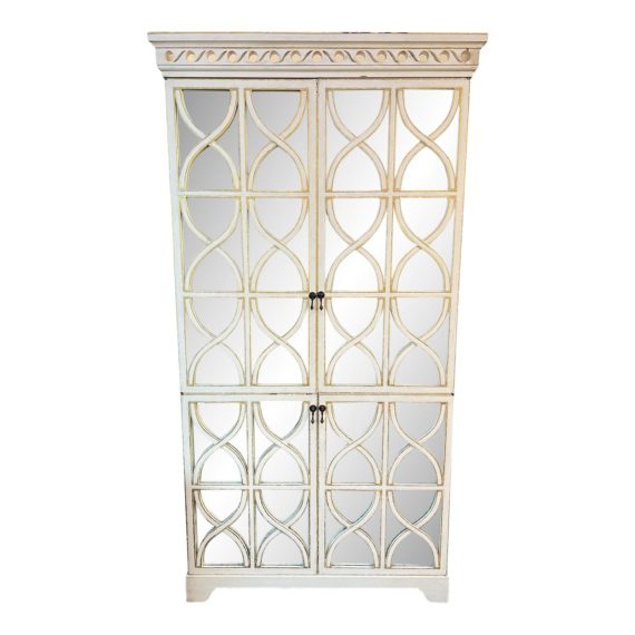 Design Plus Gallery presents an Elisabeth French Country Antiqued White Mirror Armoire by Old Studio. Features four swing open doors with antiqued mirrored panels. The inside consist of shelves with one fixed and three adjustable. The finish is an Antiqued White. Includes wiring grommet. Visible + minor wear from usage.