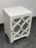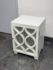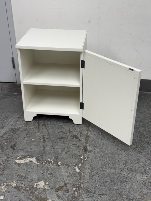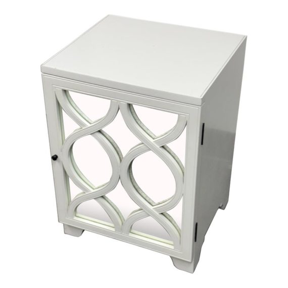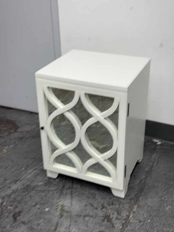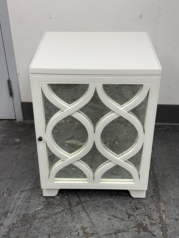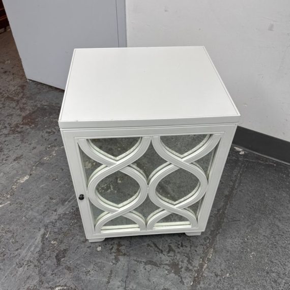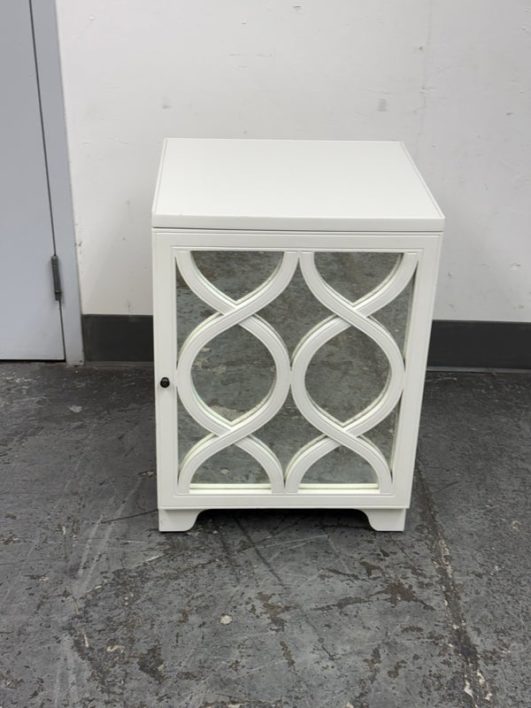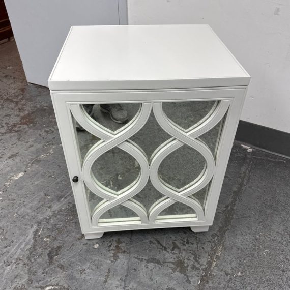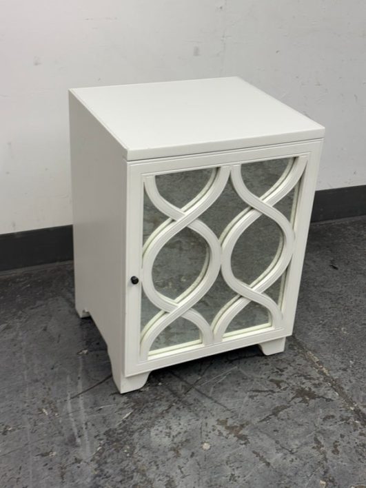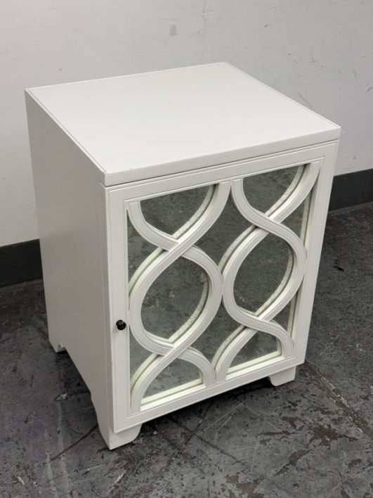 Design Plus Gallery presents a Petite Mirrored Front Cabinet with Lattice White Wood Finish on Frame and Single Left Swing Door, the Elisabeth Cabinet from Oly Studio. The door swings open to reveal an inner shelf to divide the cavity in half, is fixed. The cabinet is in good condition with minimal signs of wear for its usage. Is in good condition for its usage.