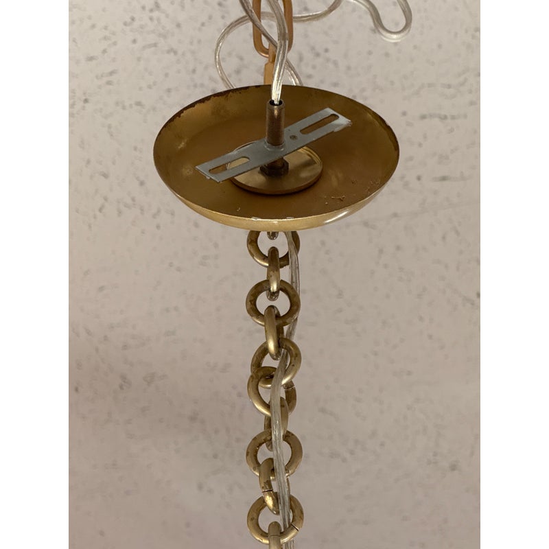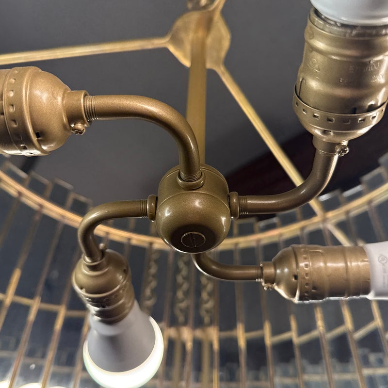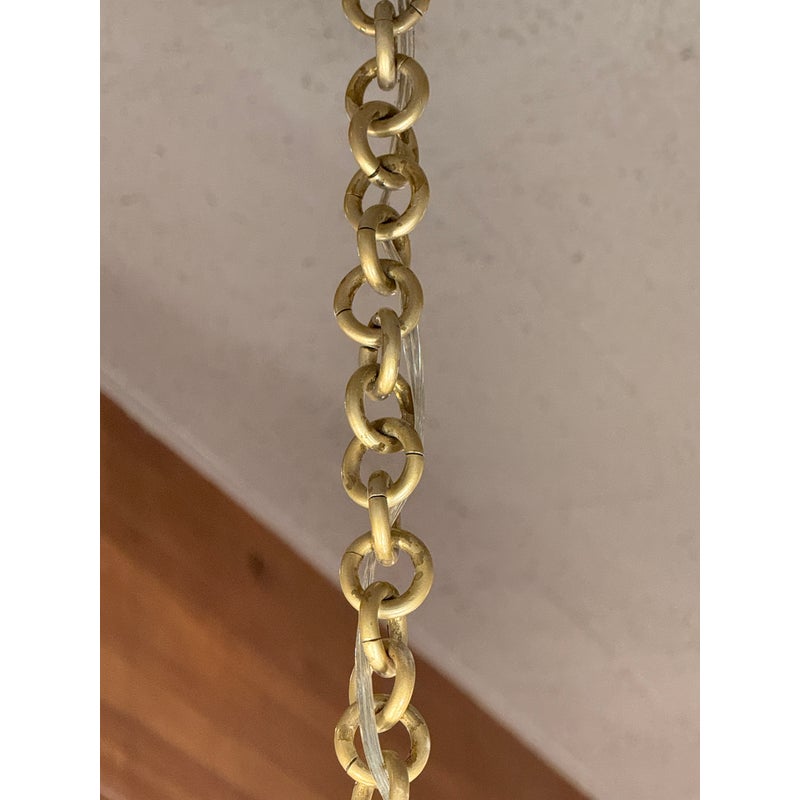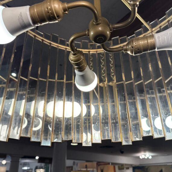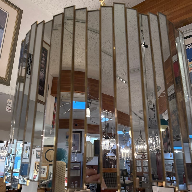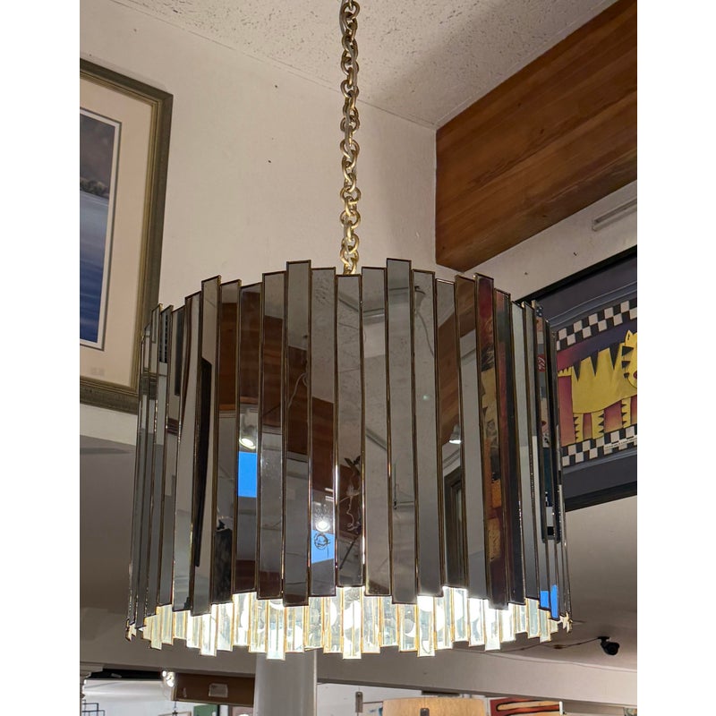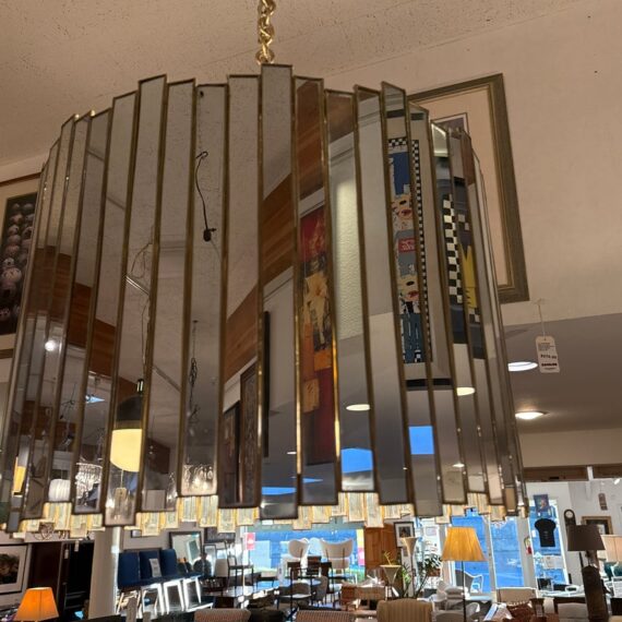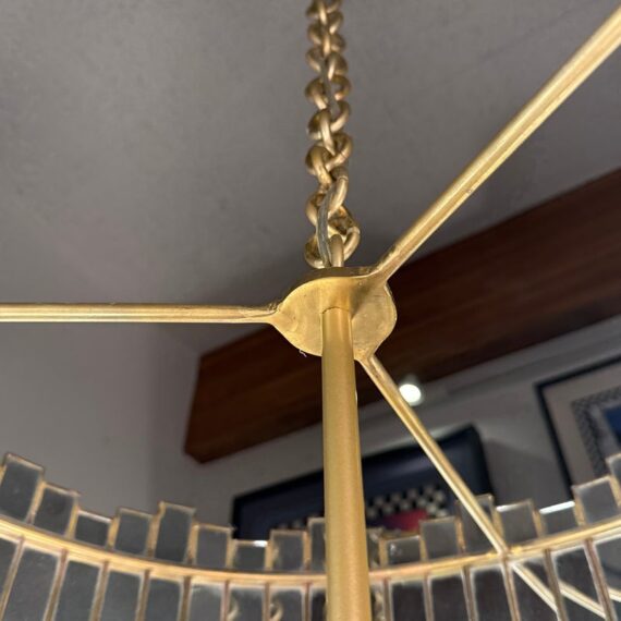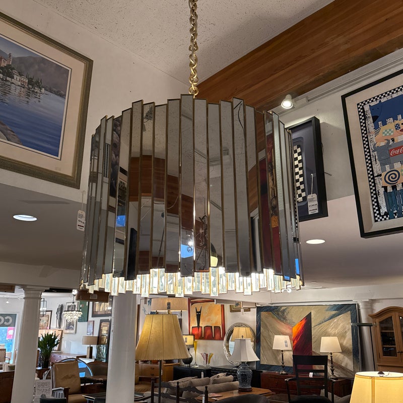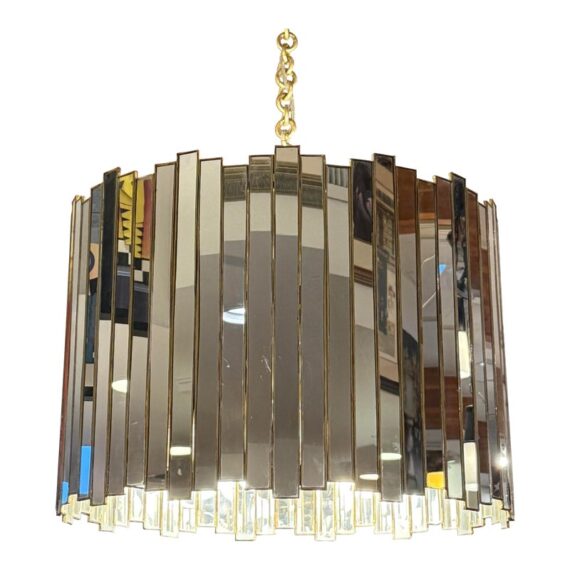 Design Plus Gallery presents a Grayson Mirrored Chandelier by Oly Studio. Elegant drum silhouette with uneven edge is a captivating blend of antiqued gold and mirror reflection. Featuring a mirrored surface with elegant brass detailing, this chandelier is available in two sizes. Complete with brass hardware, a canopy, and a 2+foot chain, it accommodates four bulbs, each not exceeding 60W (not included). Little wear; good condition.