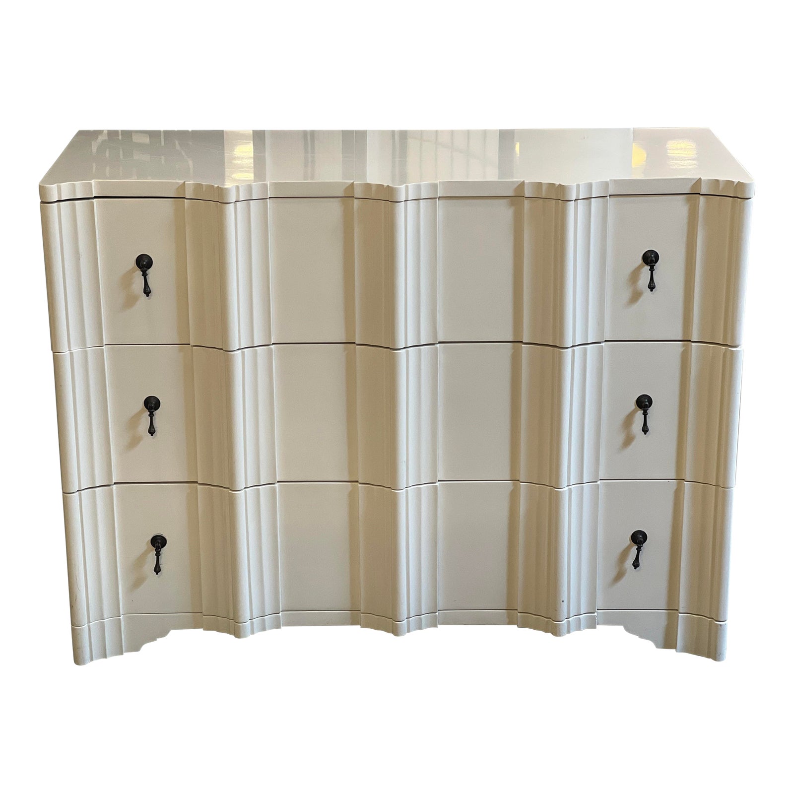 Design Plus Gallery presents a Jackson Low White Dresser by Oly Studio. Features 3-drawers with a hardwood, groove detailed facade. A chic and stylish piece with versatility and functionality storage. This chest is perfect for bedrooms and can also be used in dining rooms, entryways, and office environments alike. The hardware are metal pulls in a dark bronze finish, not original to chest. Minor wear from usage.