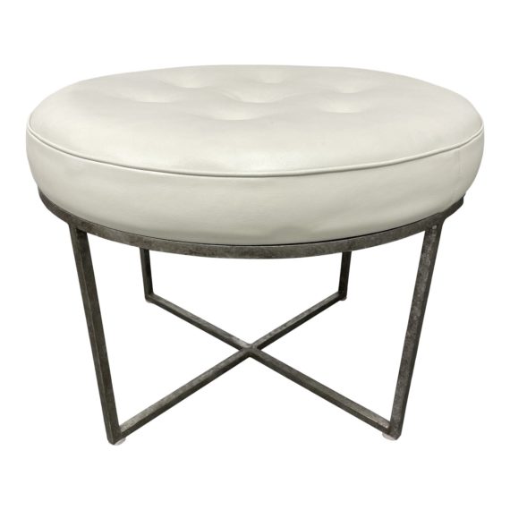 Design Plus Gallery presents an Oly Studio Jonathan Small Stool. Antiqued nickel base has a silver leaf like application in the visually light and geometric foot print. Top is button tufted with an ivory leather for a robust and light balance. Visible and minor wear through out, ottoman is in good condition.