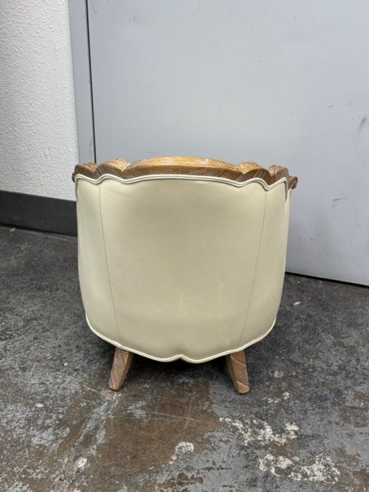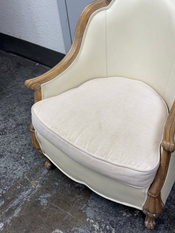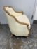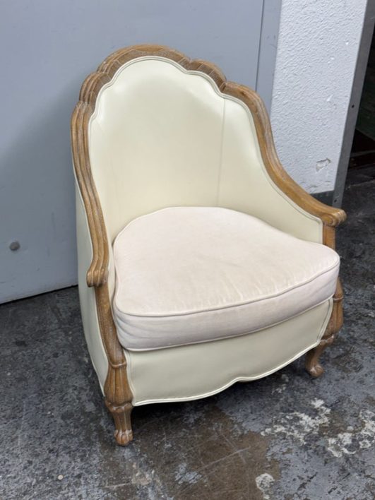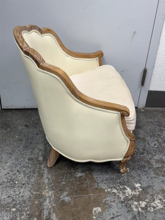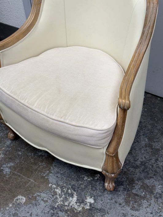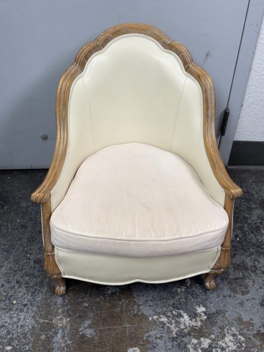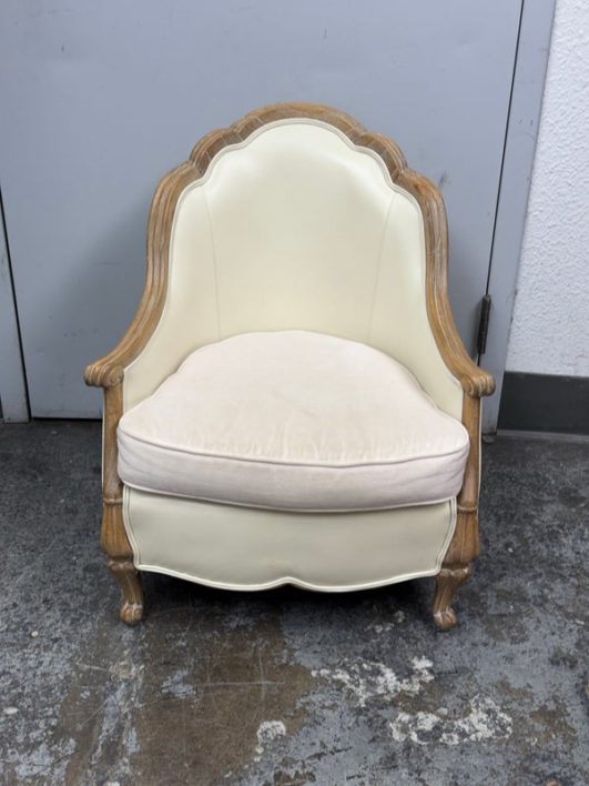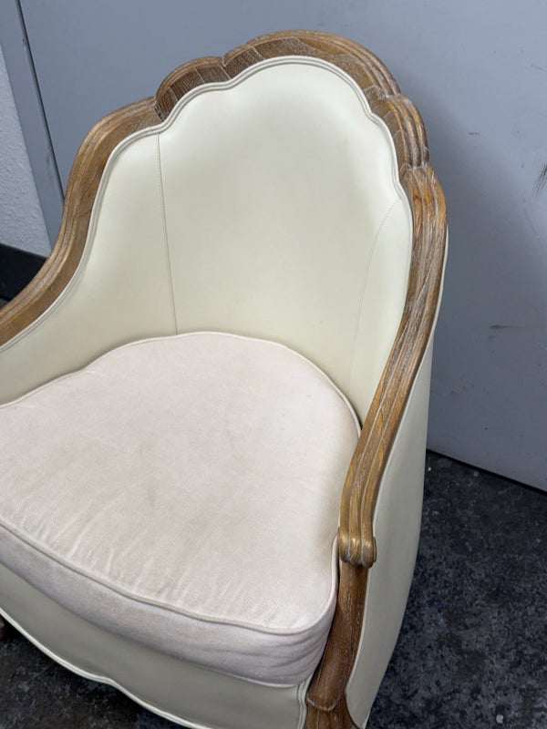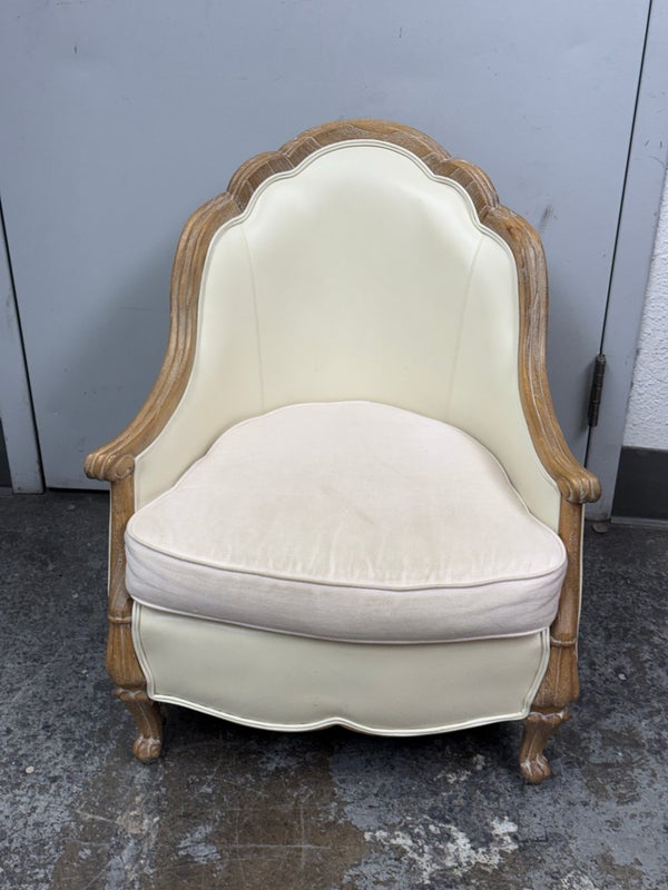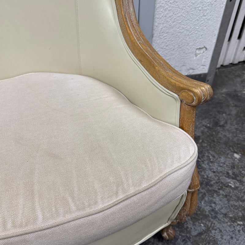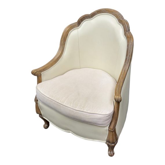 Design Plus Gallery presents the Miniaturized Version of a French Louis XVI Arm Chair from Oly Studio. the Petite Belle Lounge Chair is custom fabricated in the cream upholstery with oak wood frame just for your little princess, or mini-me. Visible wear on fabric, but overall is in good condition for usage.