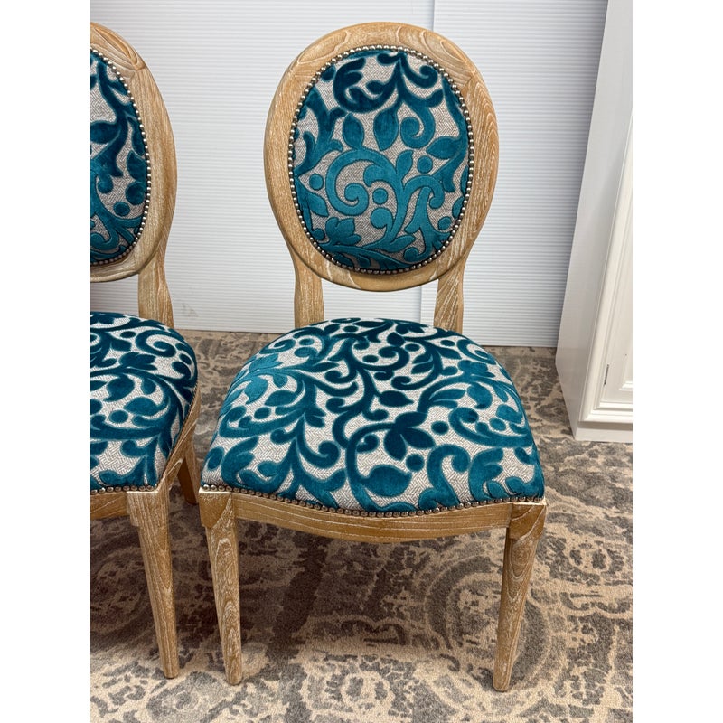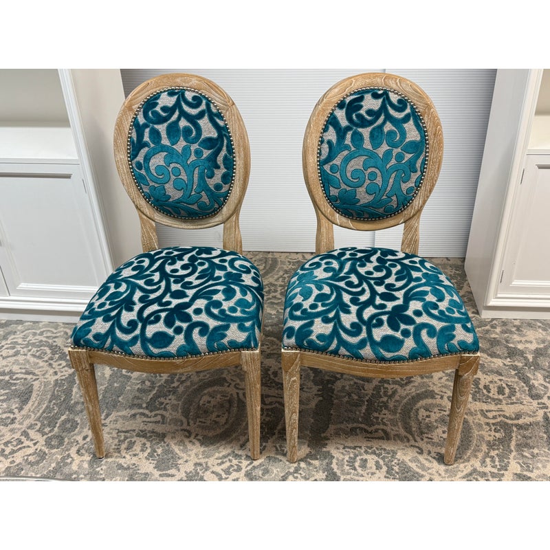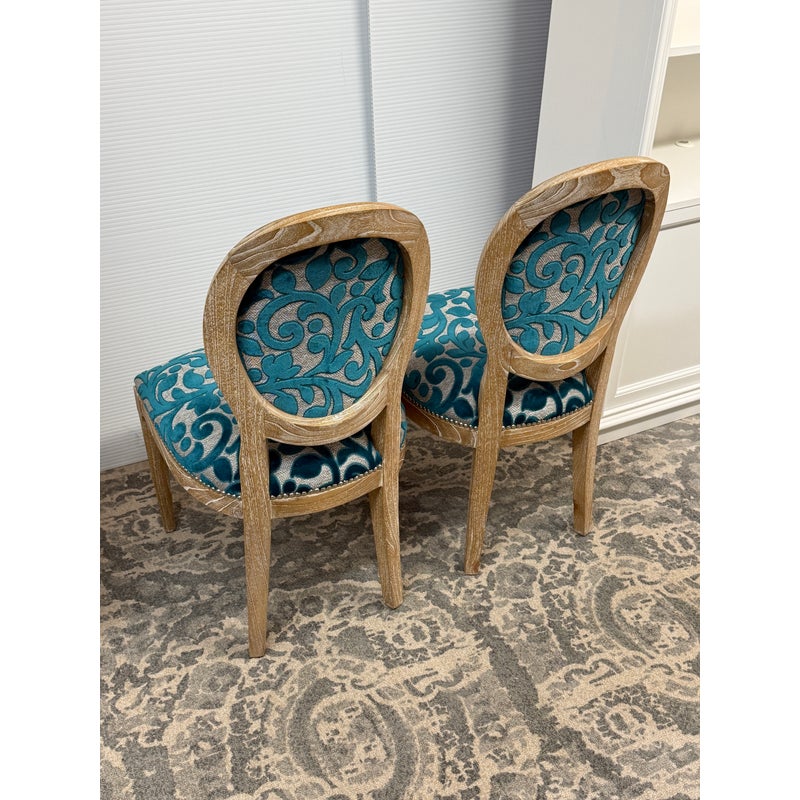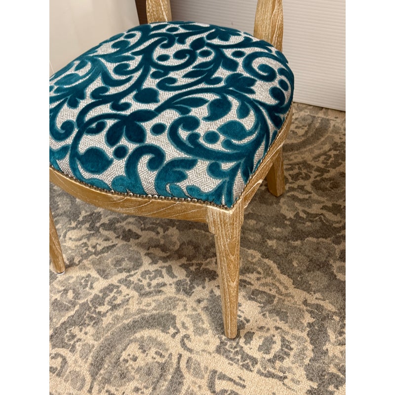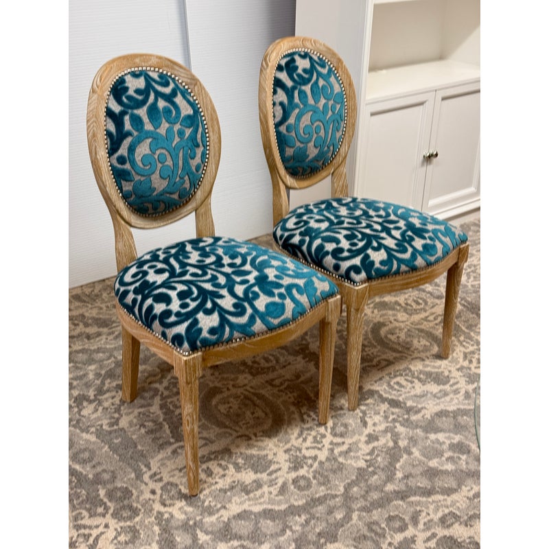 Design Plus Gallery presents a Pair of Tyler Side Chairs by Oly Studio. The wood frames are in a drift wood finish. Upholstered in a wool cut botanical print over a herringbone pattern. In good condition, minimal wear from usage.