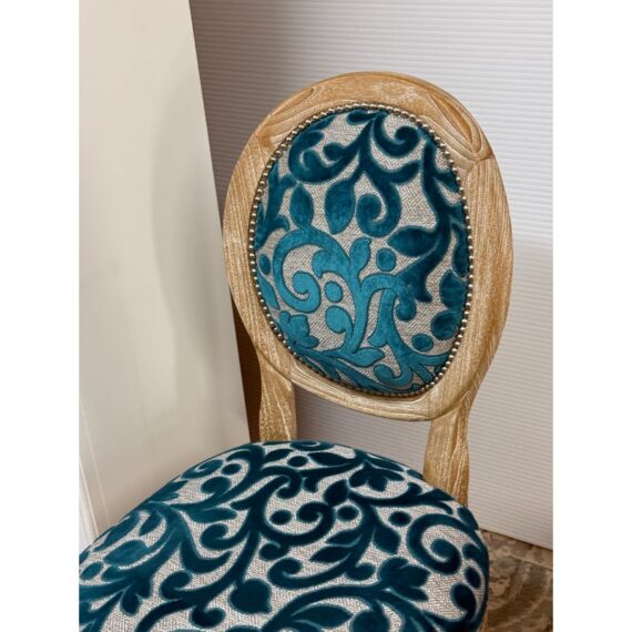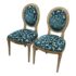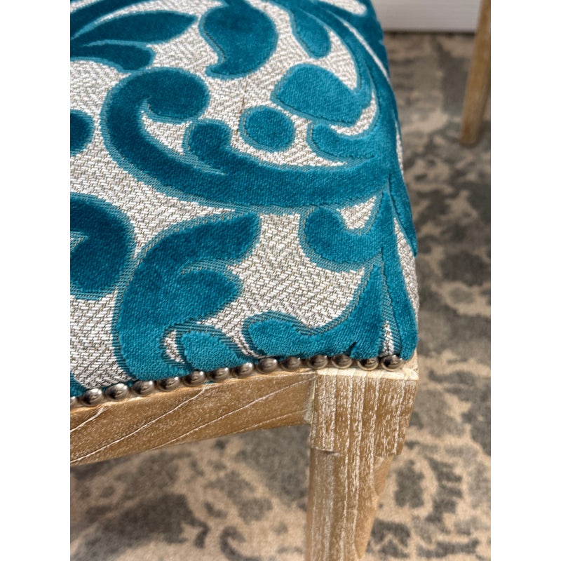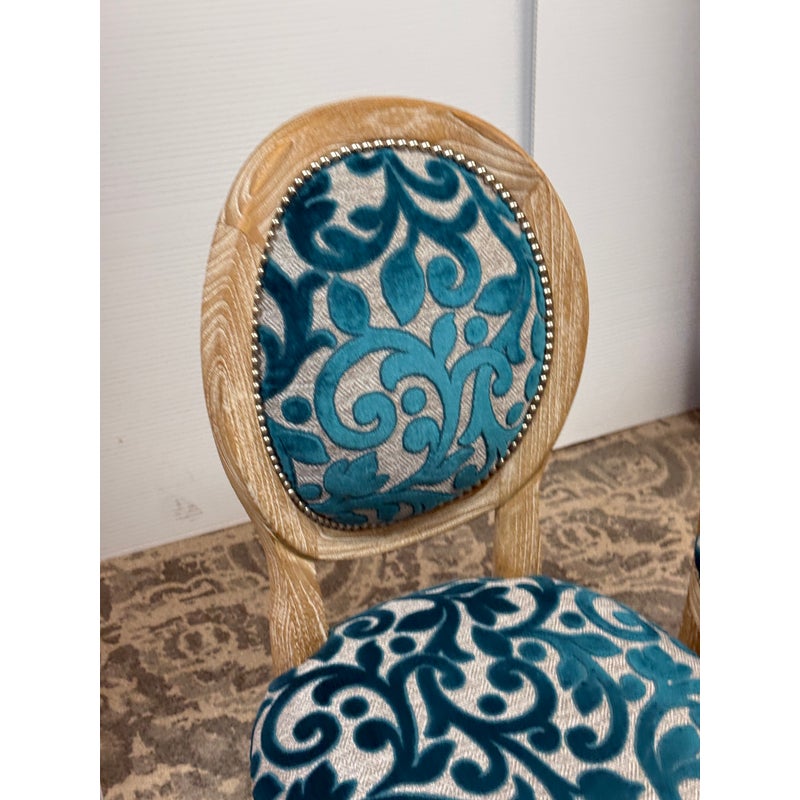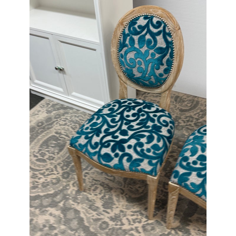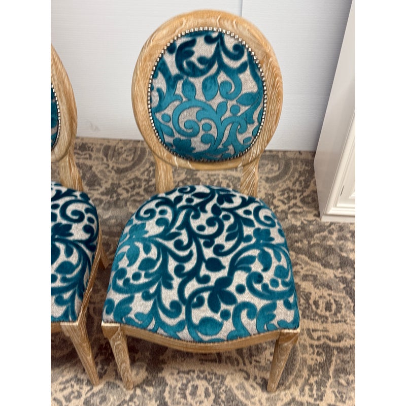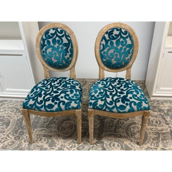 Design Plus Gallery presents a Pair of Tyler Side Chairs by Oly Studio. The wood frames are in a drift wood finish. Upholstered in a wool cut botanical print over a herringbone pattern. In good condition, minimal wear from usage.