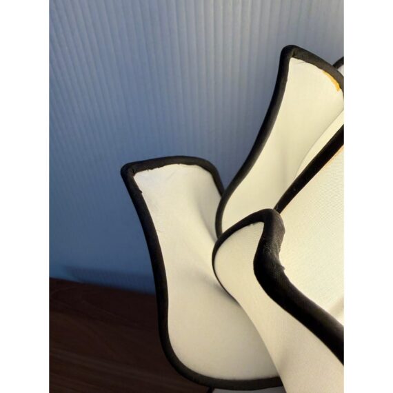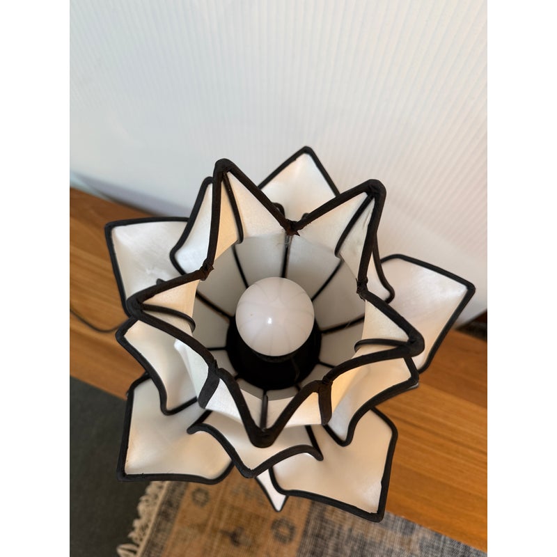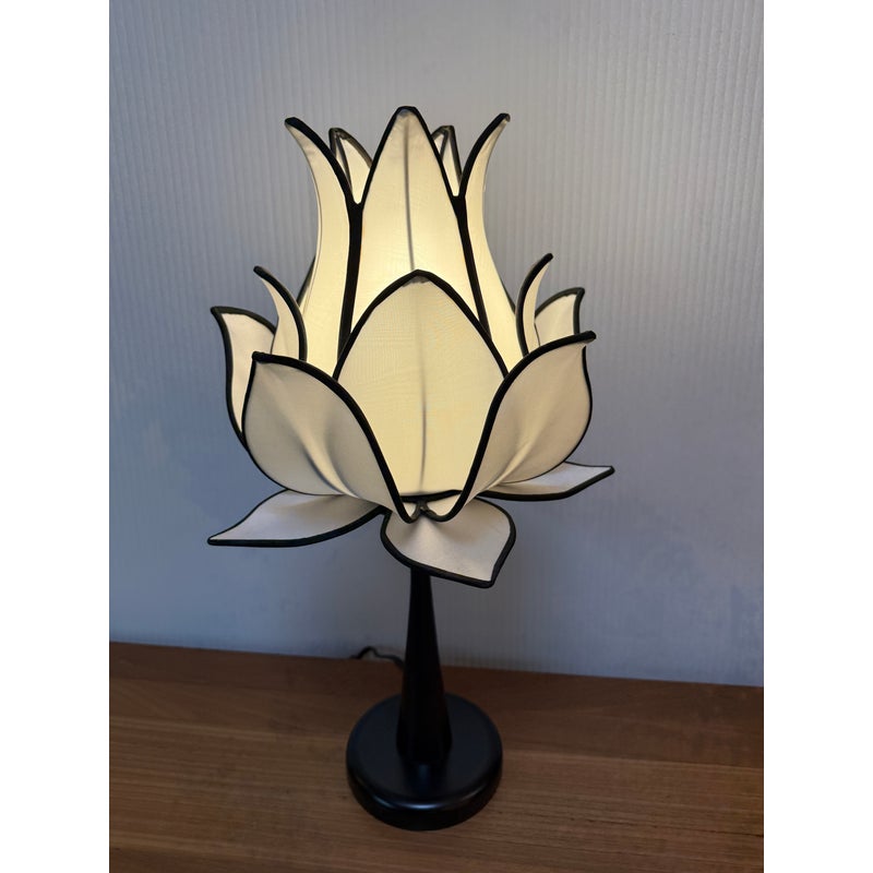 Design Plus Gallery presents the Baby Blooming Lotus Table Lamp from OM Gallery. This handmade and pure decor accent lamp is constructed with a silk shade, metal frame, and ebony wood base. It is operable with a switch on cord and is in good condition with minor wear for its usage.